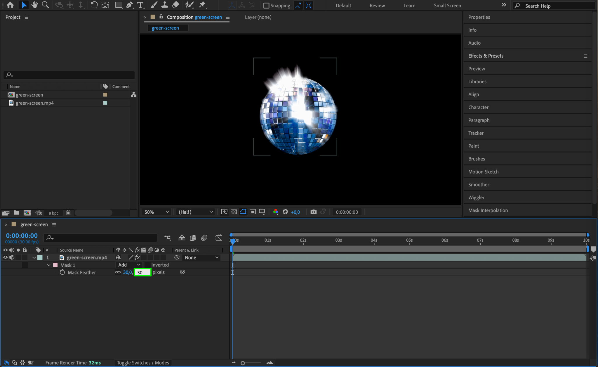 Select your mask in the timeline and adjust the Mask Feather property to soften the edges. This helps blend the subject naturally with the new background. A feather value of 10-30 pixels often works well, but this depends on the footage.