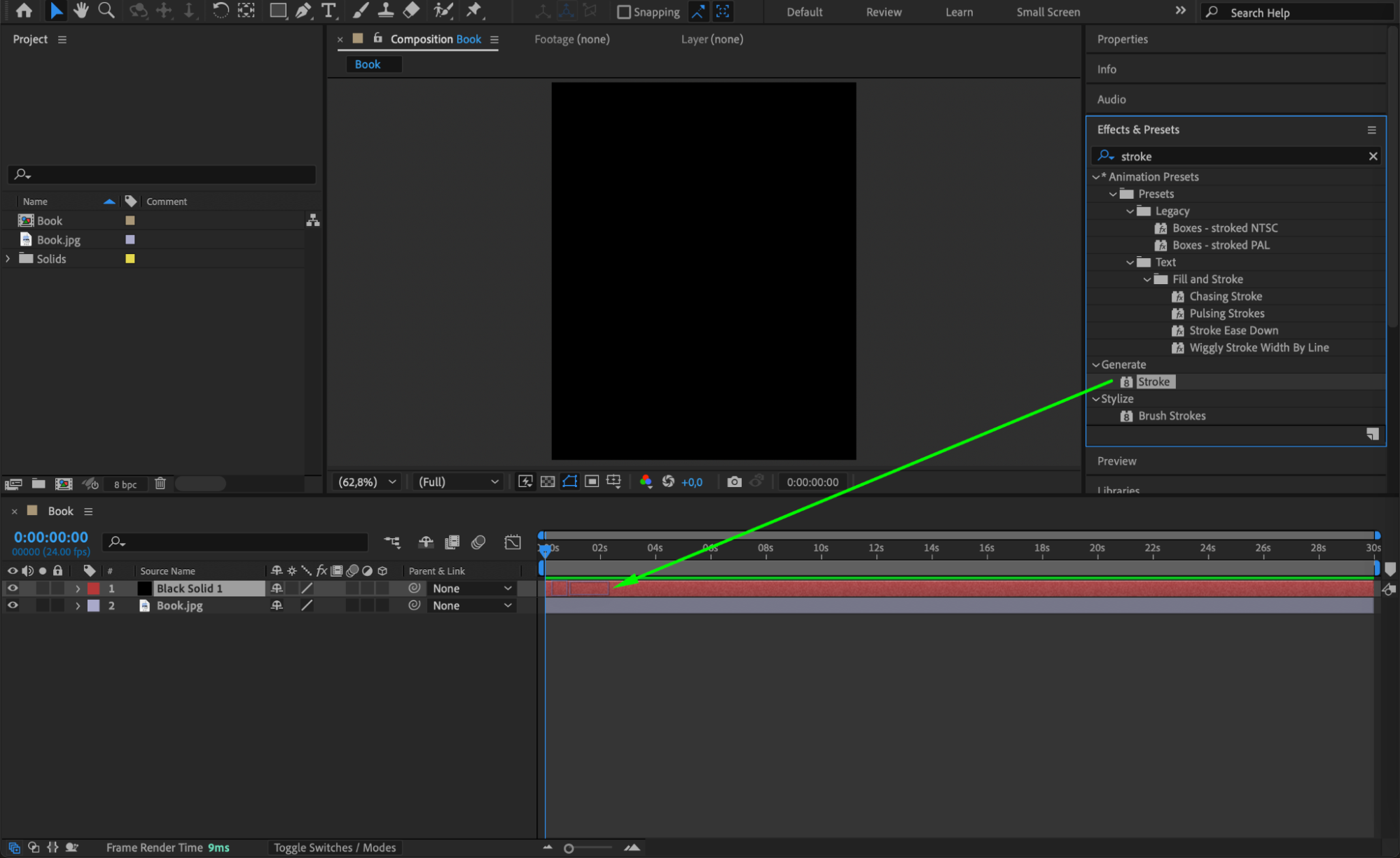 Open the Effects & Presets panel and search for Stroke. Drag and drop the effect onto the solid layer.