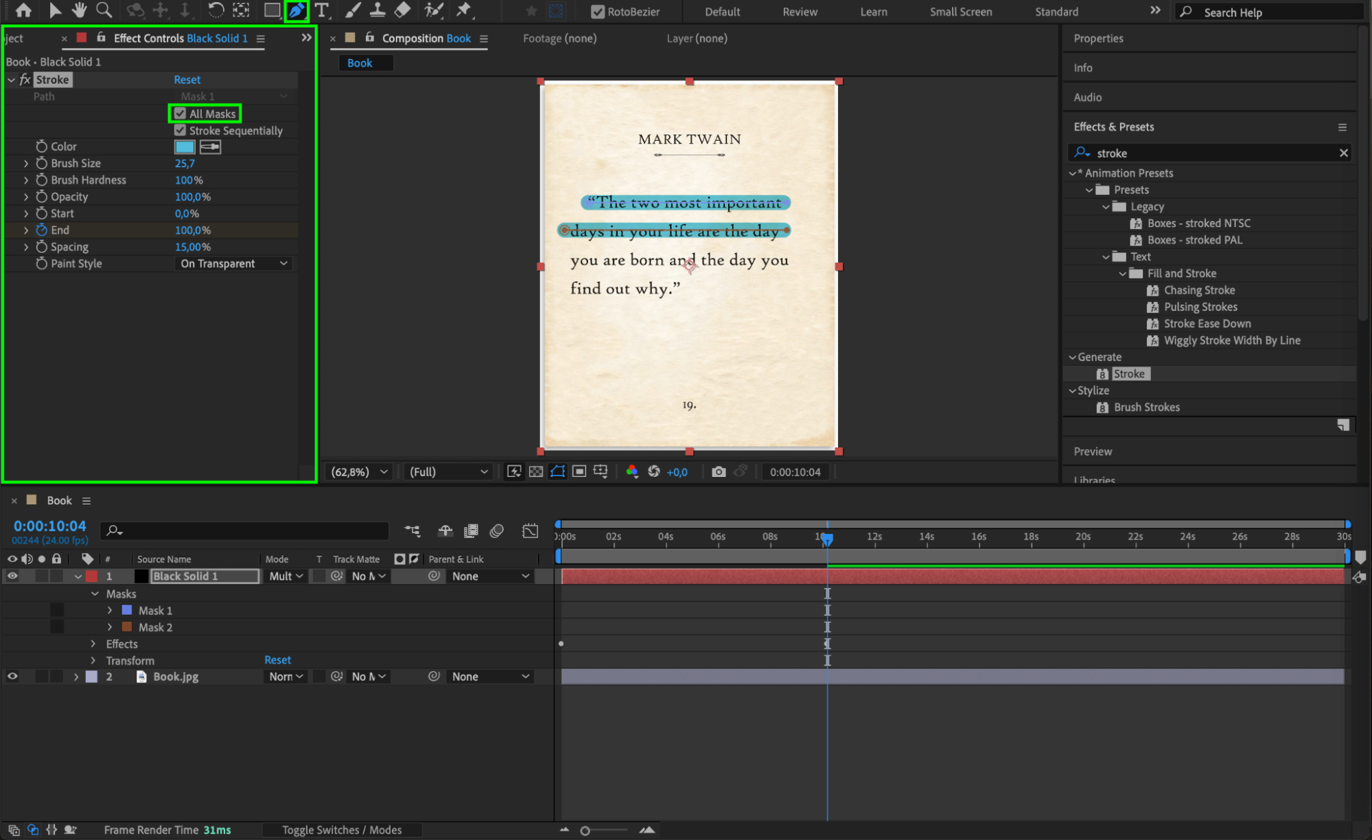 If you want to highlight multiple lines, create additional masks on the solid layer. In the Effect Controls Panel, check All Masks to apply the effect to all the selected areas.