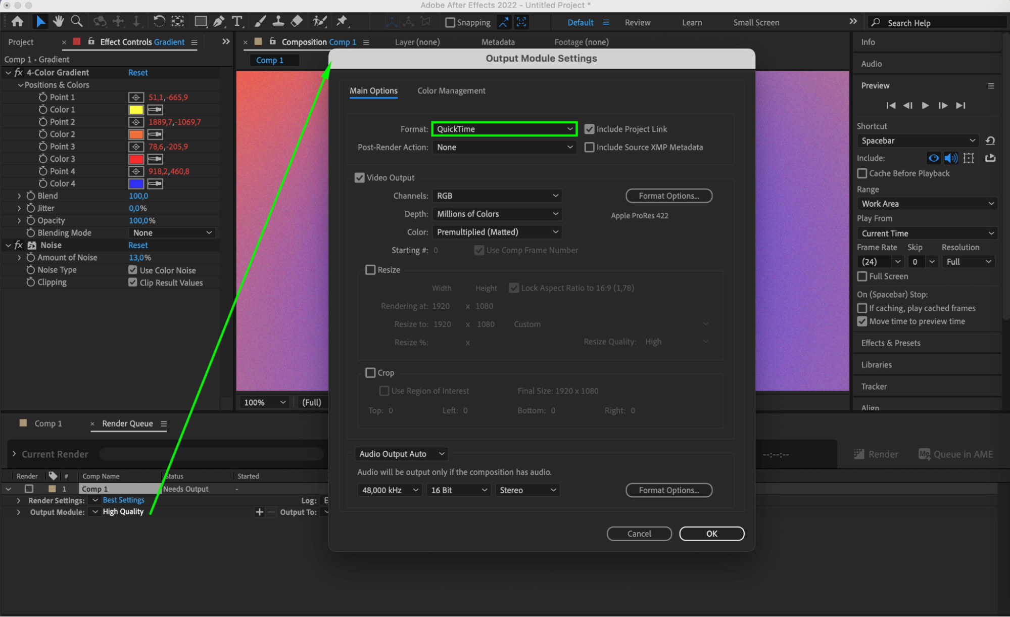 In the Render Queue panel, go to the “Output Module Settings” section and choose the desired format for your project. For Premiere Pro, QuickTime is commonly used. Make sure to select an appropriate codec and other settings.