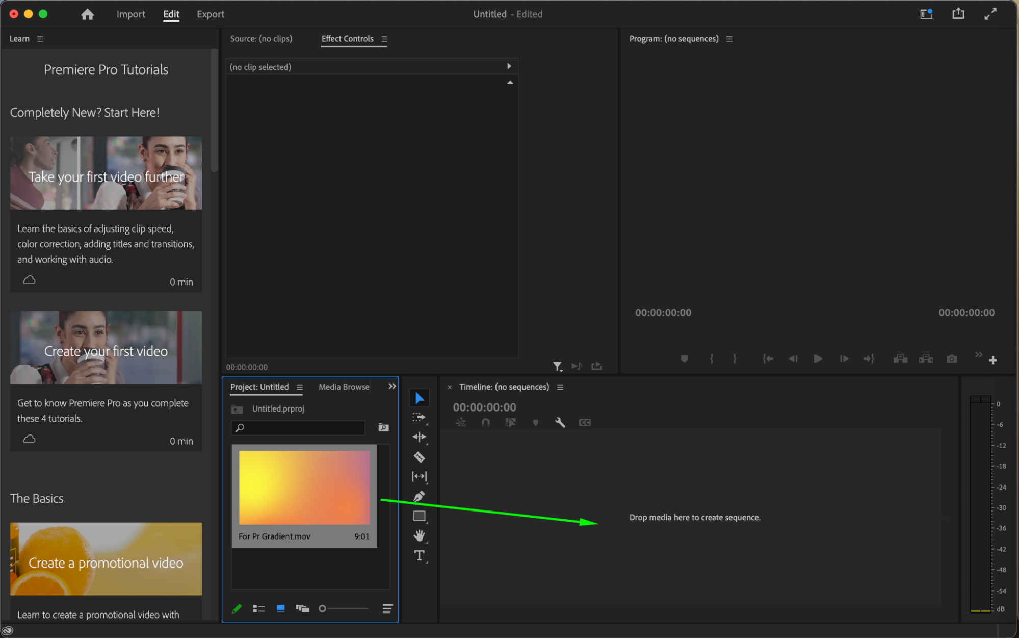 Drag the imported file from the project panel to the timeline panel to start editing your project in Premiere Pro.