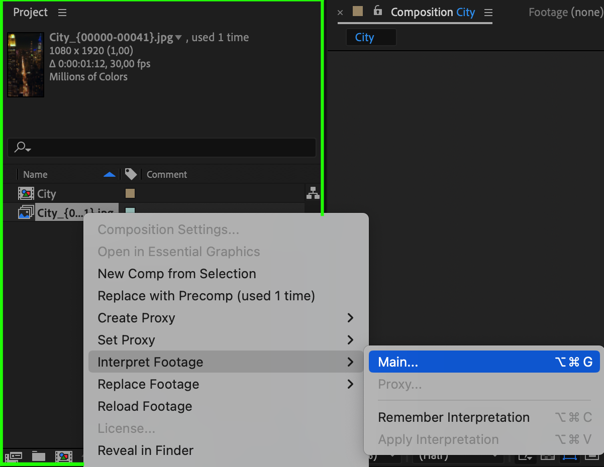 Once the image sequence appears in the Project Panel, right-click on it and choose New Composition from Selection. This will create a composition where the images are combined into a single animated layer.