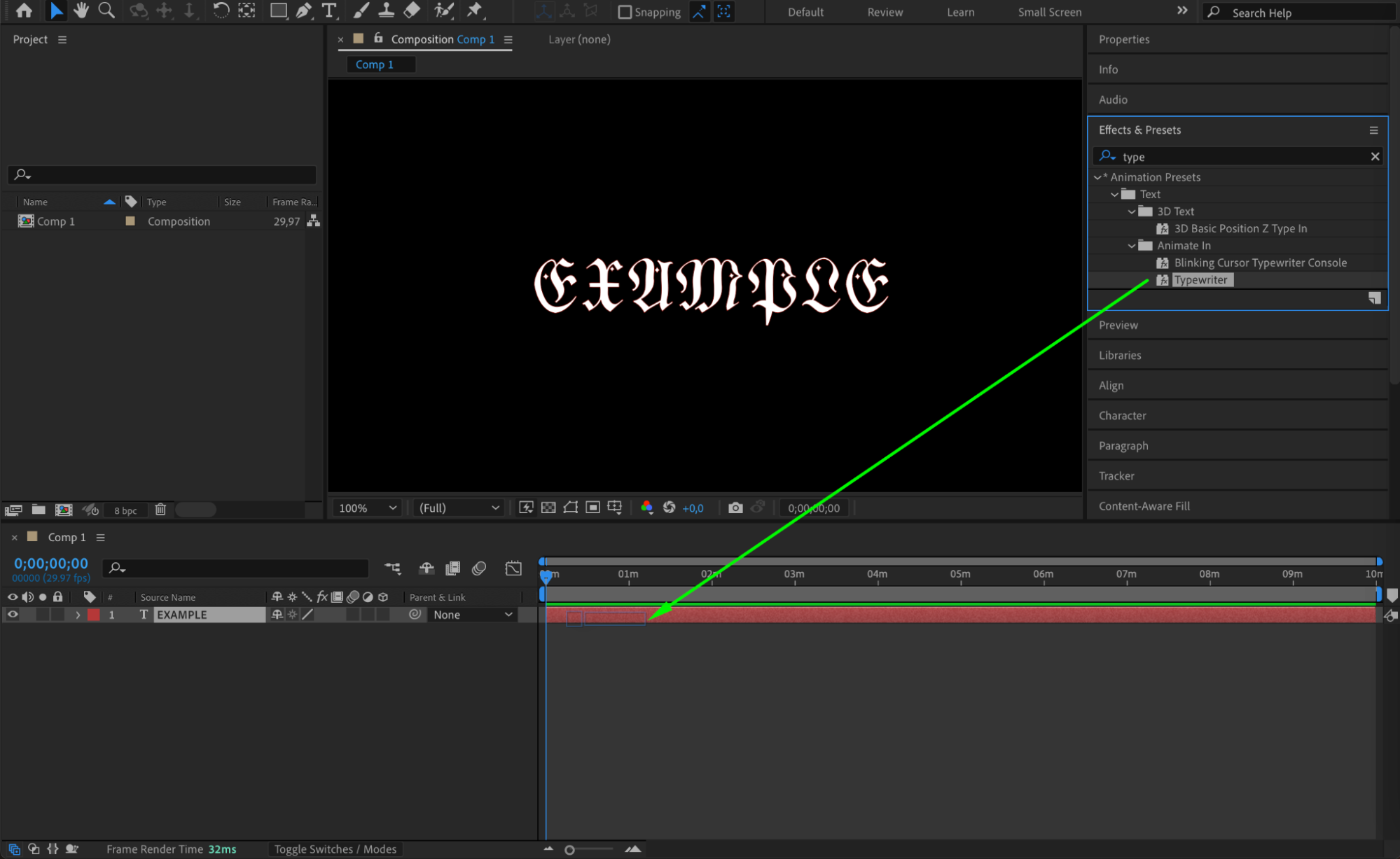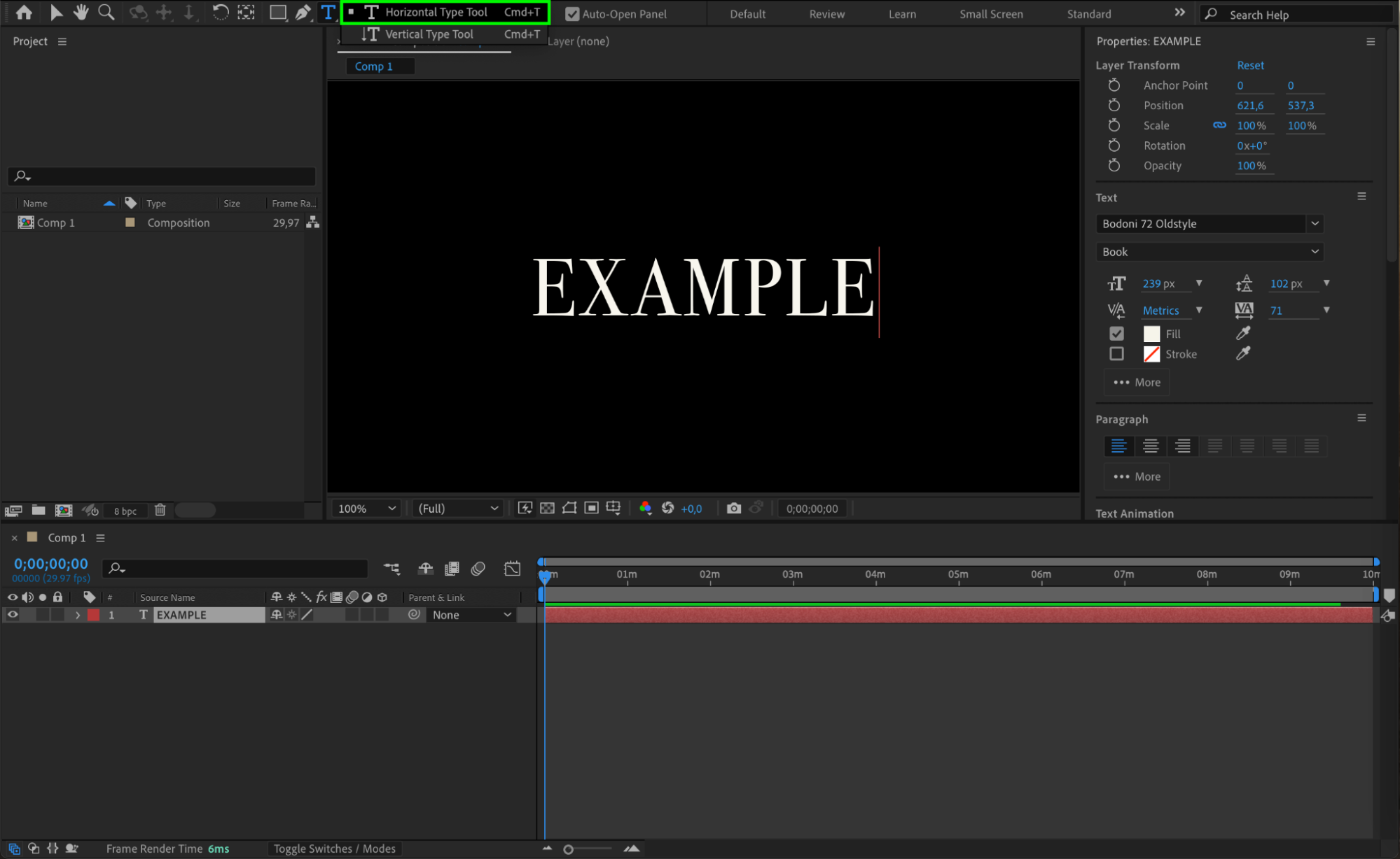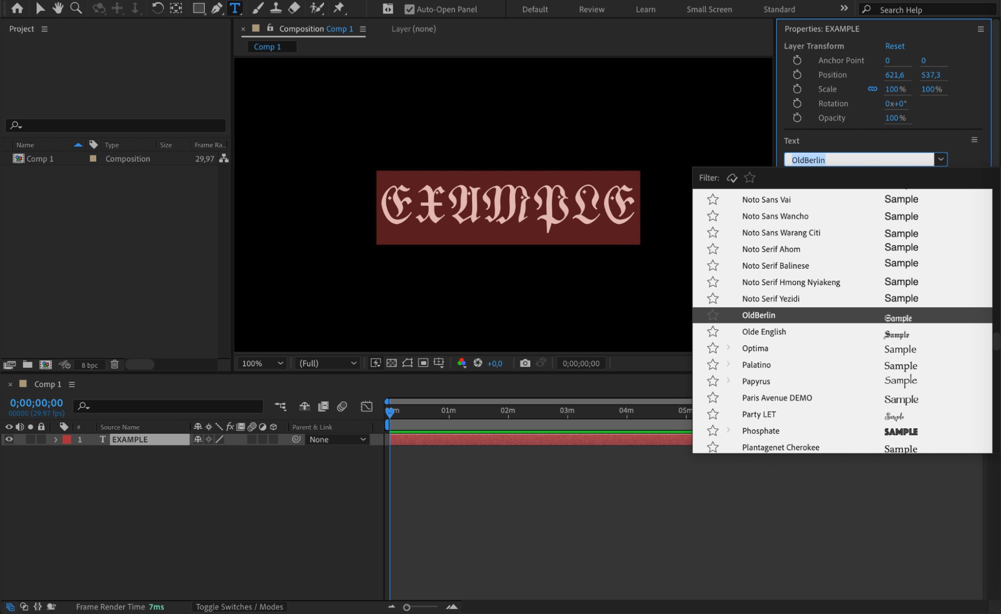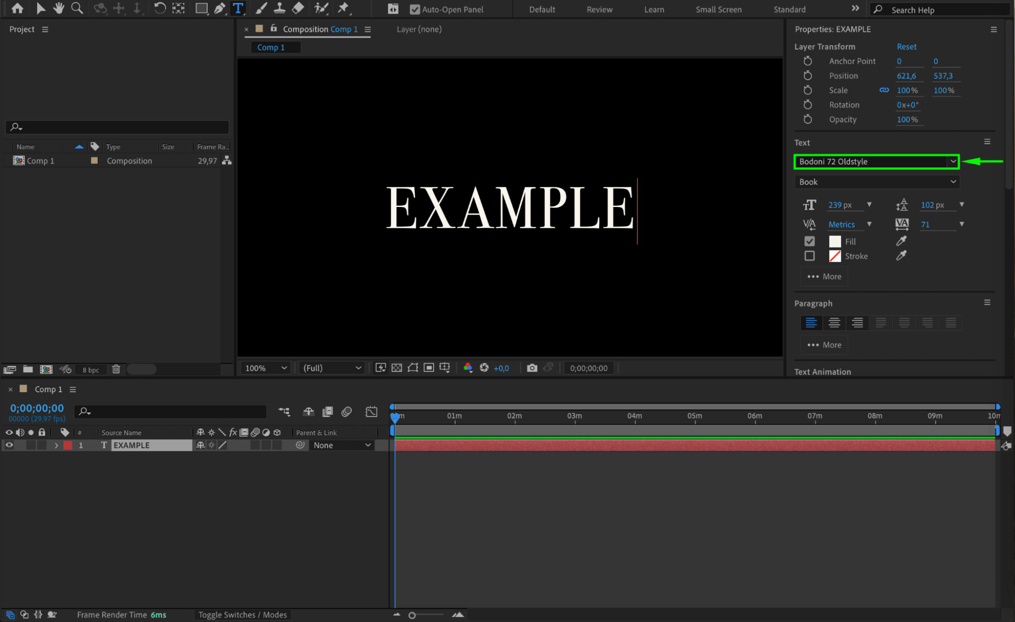 With your composition ready, it’s time to create text using your newly installed font. Select the Type Tool (Ctrl/Cmd + T) from the toolbar and click anywhere in your composition to start typing. A text layer will be created automatically. To change the font, go to the Character or Text panel (usually located on the right side of the screen). Click the drop-down menu in the font selection box, scroll through the list, and find the font you just installed. Select it to apply the font to your text layer.