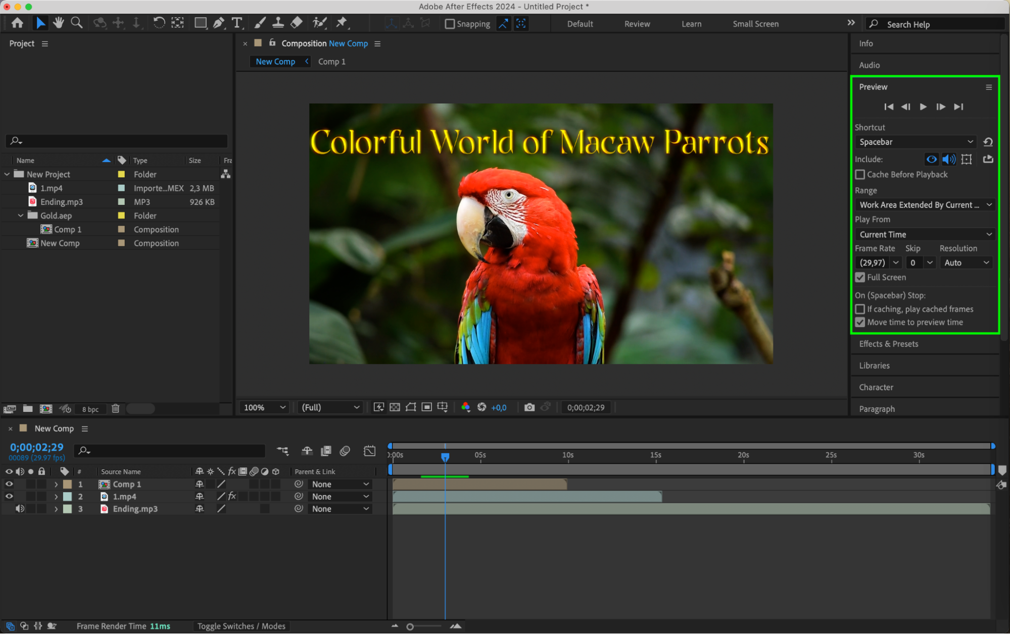 Once your files are arranged in a composition, you can preview your work by pressing the spacebar or using the preview panel and hitting the play button. This playback allows you to see your project in motion, making it easier to adjust animations and effects.