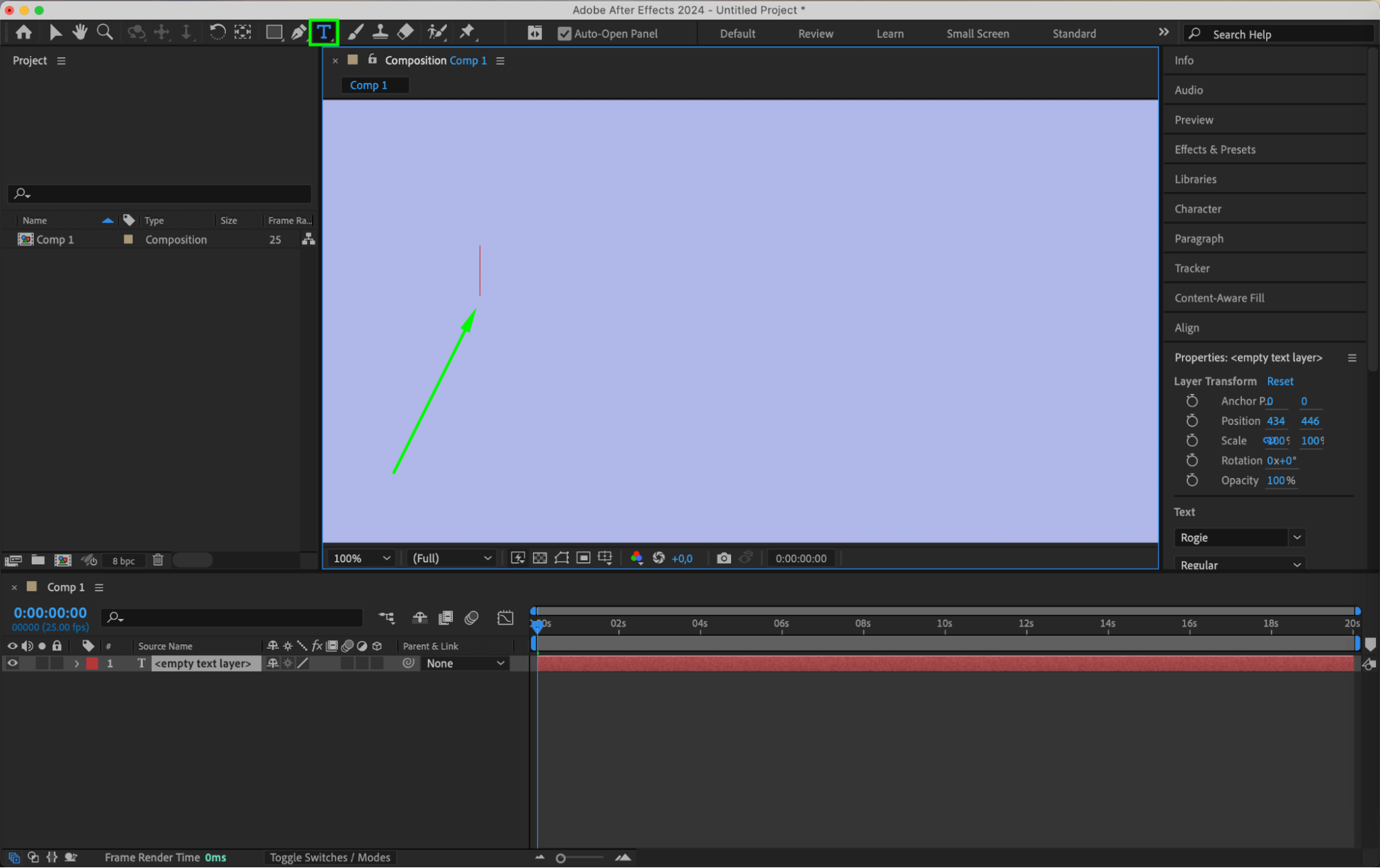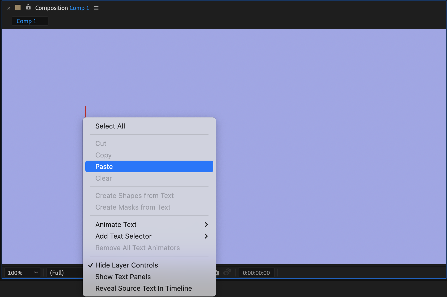 Now it’s time to add the text to your composition. Select the Text tool from the toolbar or use the shortcut key (Ctrl/Cmd + T). Click anywhere in the composition window to create a text box. When the text cursor appears, right-click and select “Paste” from the submenu to insert your copied text. This creates a new text layer that you can further customize.