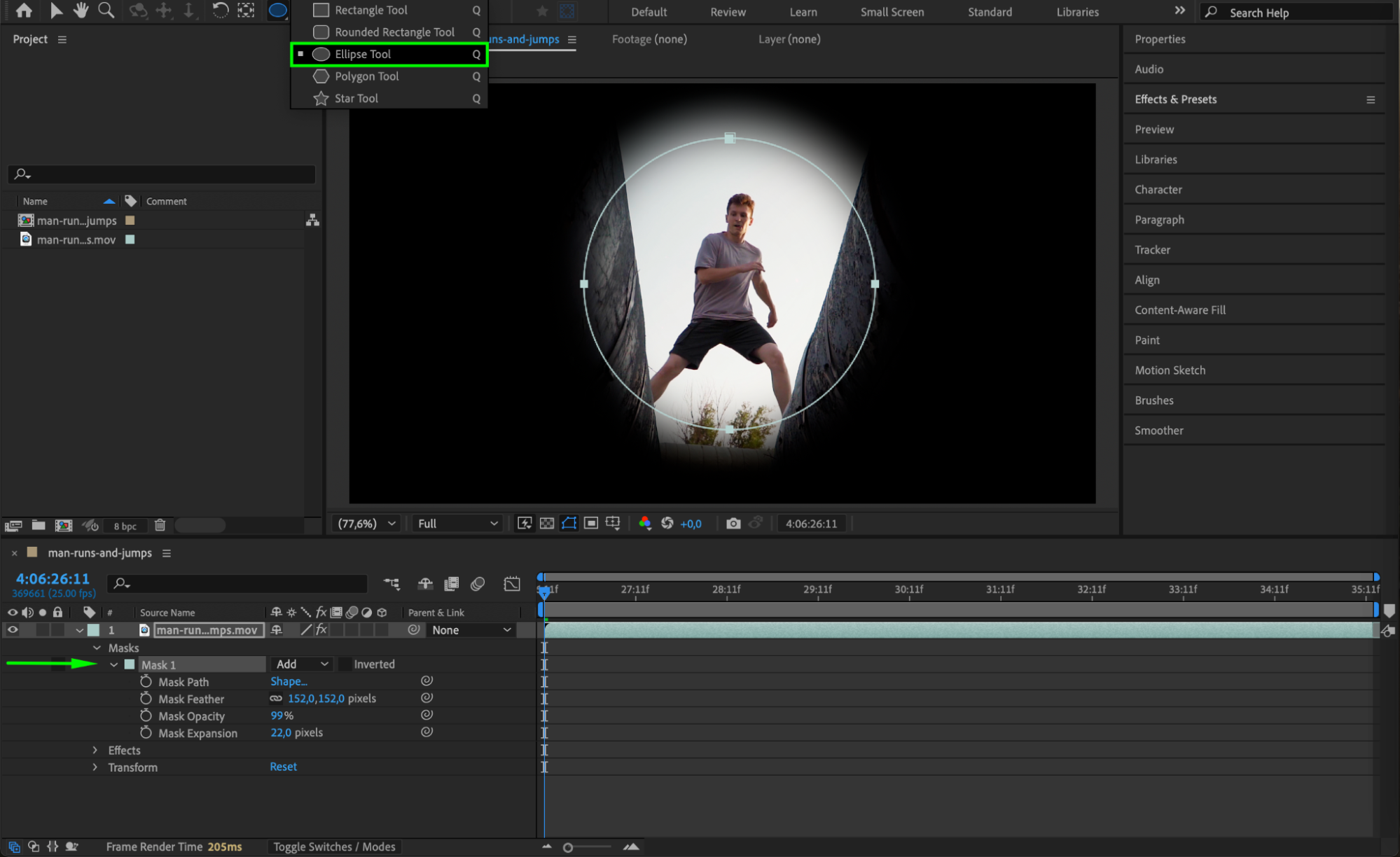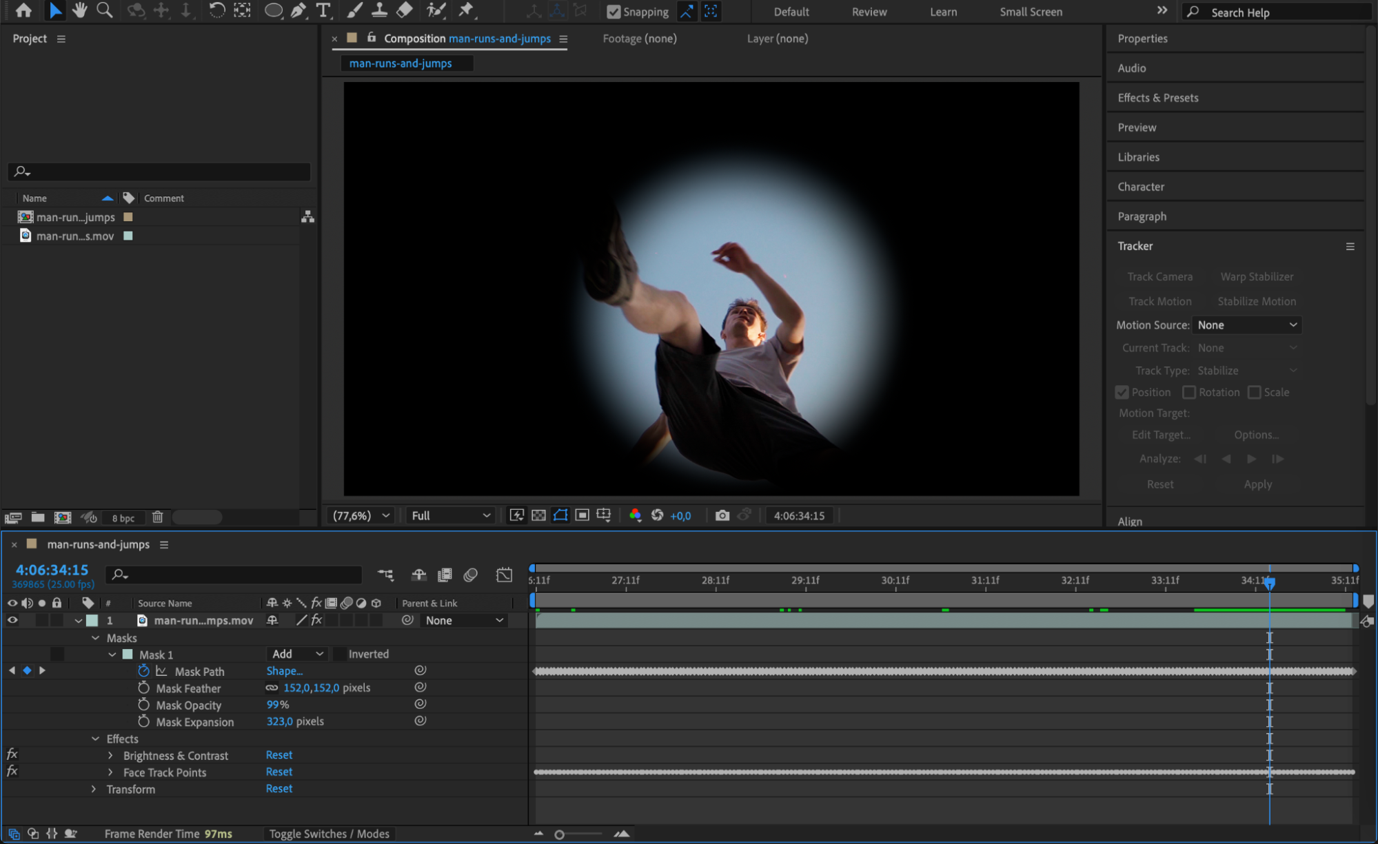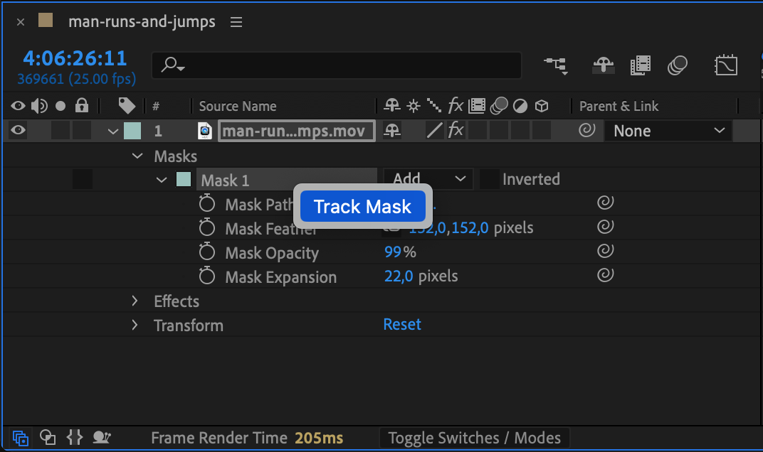 Right-click directly on the mask path in the timeline and select Track Mask. This will activate the Tracker panel with settings specific to mask tracking. You are now ready to begin tracking the movement of the mask.
