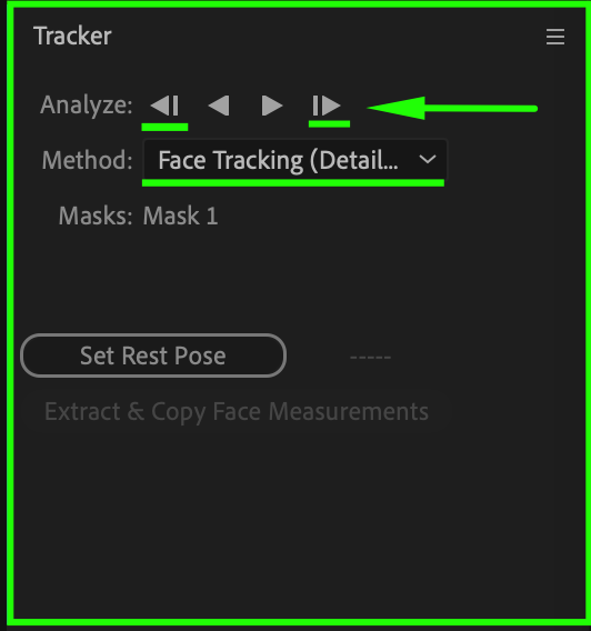 In the Tracker panel, choose a tracking method. If you’re tracking a face or complex motion, select Face Tracking (Detailed Features) for better accuracy. Use the Analyze Forward or Analyze 1 Frame Forward buttons to move frame by frame. This helps ensure the tracking stays precise and allows you to make adjustments as needed.