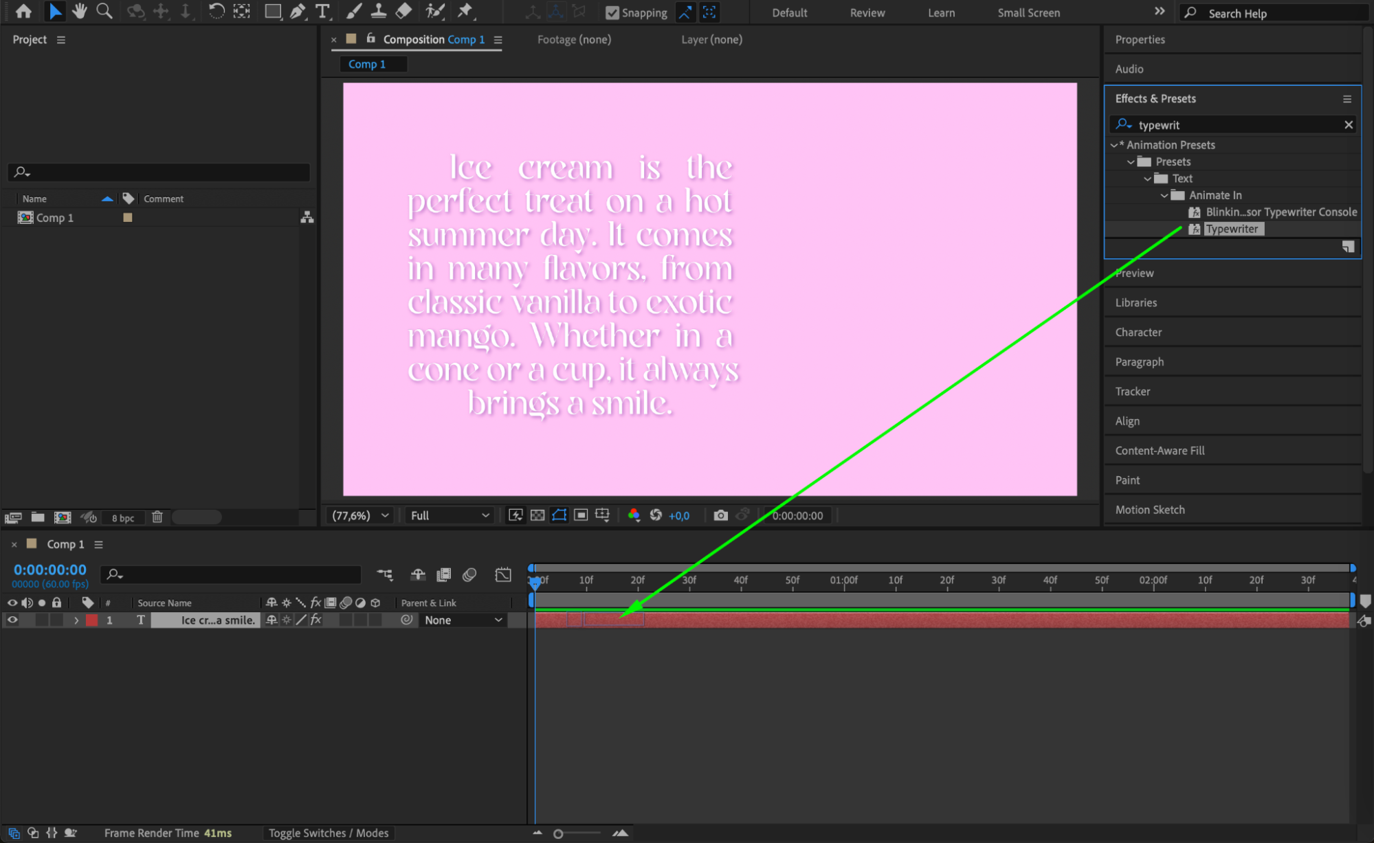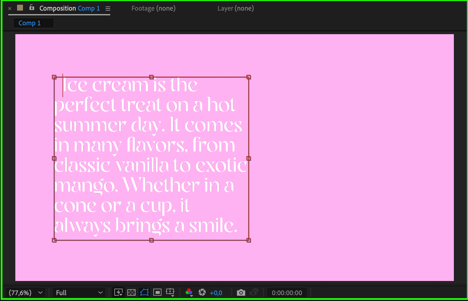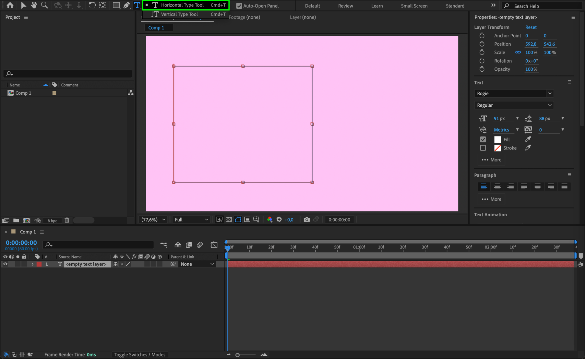 Open After Effects and create a new composition by going to Composition > New Composition. Then use the Type Tool (Ctrl/Cmd + T) to create a text box on the screen. Click and drag to create a text area box if you want your text to wrap automatically.
