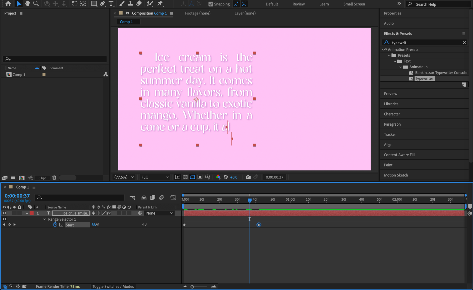 To add animation, you can create a custom text animation using keyframes for properties like opacity, position, or scale. Alternatively, use the built-in Typewriter animation preset by going to Animation > Browse Presets > Text > Animate In > Typewriter and applying it to your text layer.
