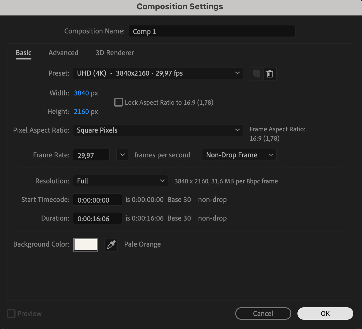 Open After Effects and go to Composition > New Composition. Set the resolution, frame rate, and duration according to your project needs, then click OK to create the composition.