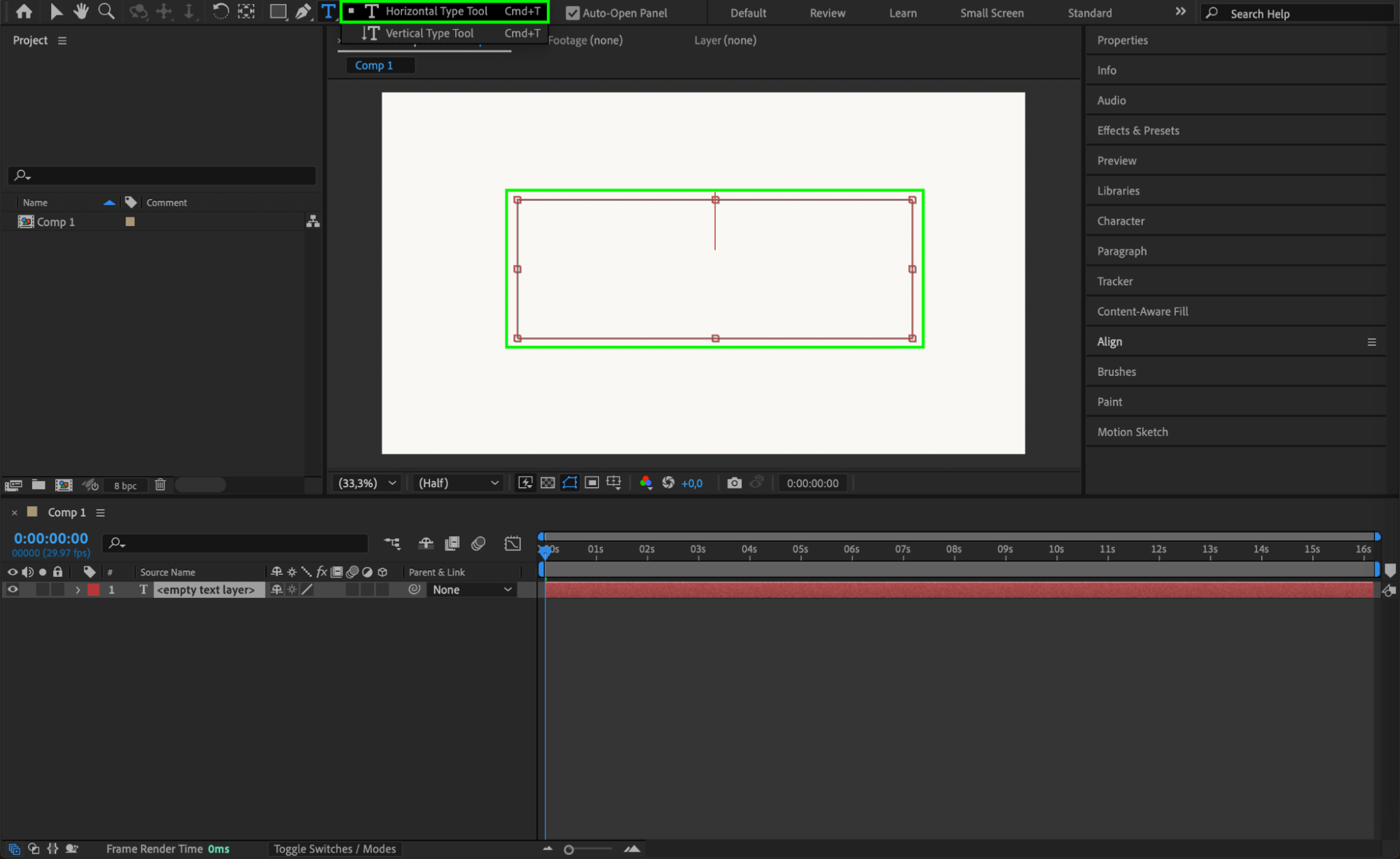 Choose the Type Tool (Ctrl/Cmd + T) from the toolbar and click anywhere in the Composition Panel to create a text layer. This is where you will insert the glyphs.