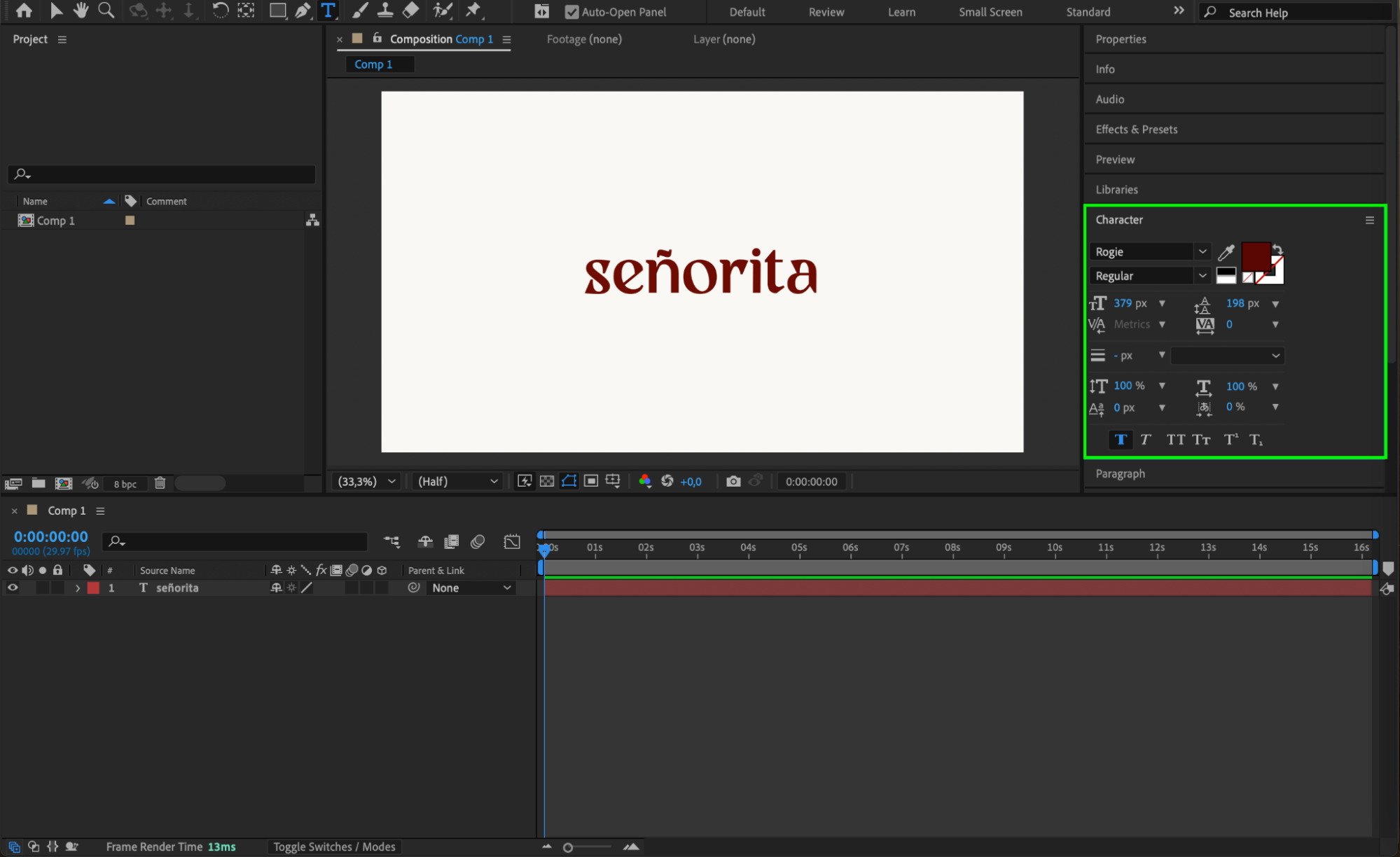 Use the Character Panel to adjust the font, size, color, and spacing of the glyph. Open the Align Panel to center or position it correctly within the composition.
