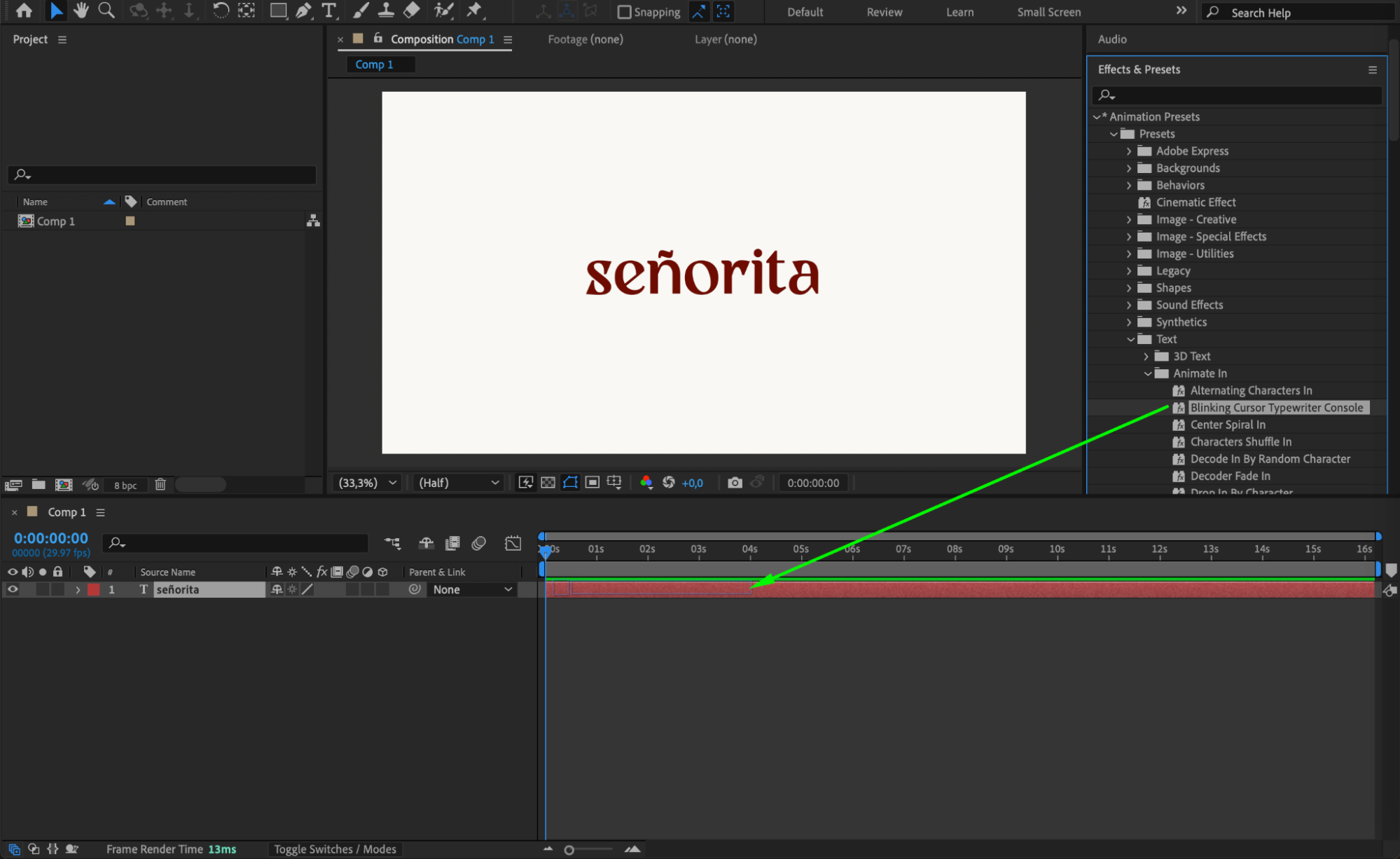 Go to the Effects & Presets panel and explore Text Animation Presets to animate your glyphs. You can add fades, zooms, or motion effects to make the glyphs more dynamic.