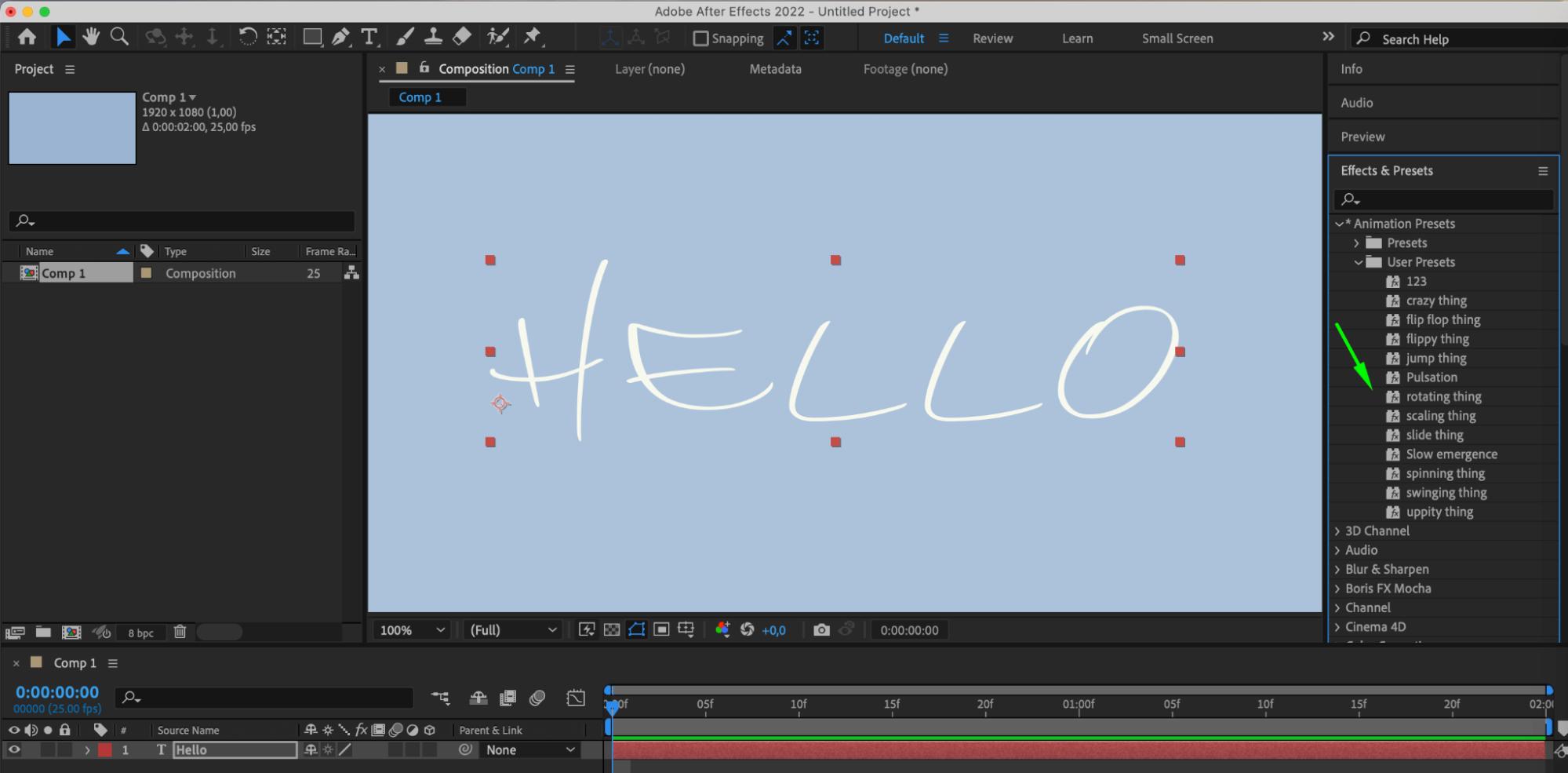 Drag any preset from the User Presets folder onto the composition panel to apply it to your layers. You can then further customize the visual appearance using the Effect Controls panel.