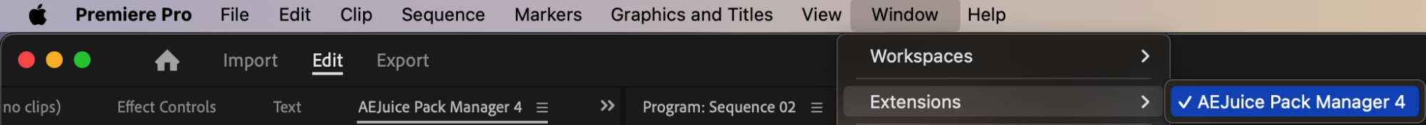 Go to Window > Extensions > AEJuice Pack Manager 4 to open the plugin panel. This is where you’ll find and access all of your AEJuice packs, including transitions, titles, effects, and more.