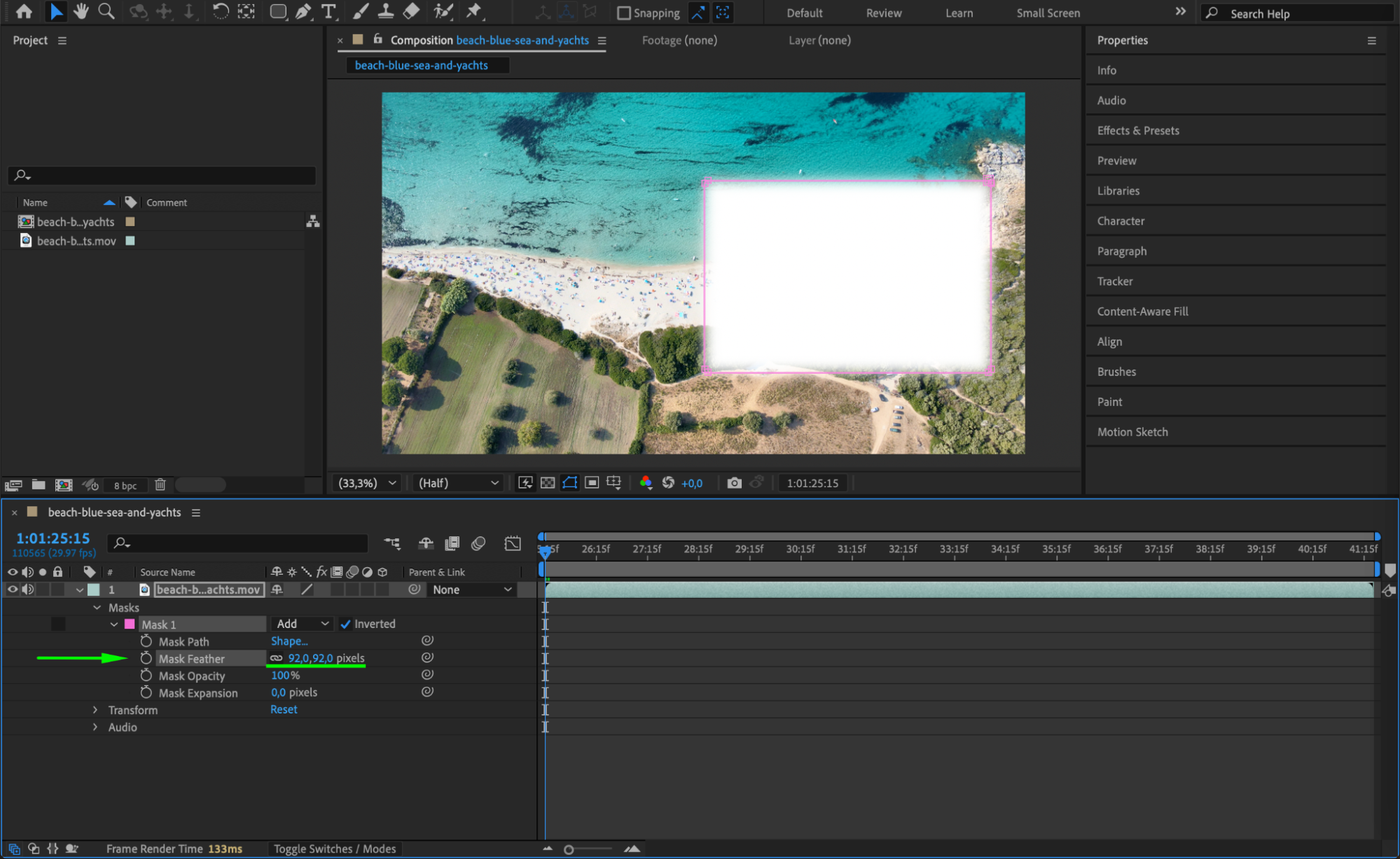 Step 4: Adjust Feathering and Opacity (Optional)To refine the mask, adjust its Feather, Opacity, and Expansion settings in the Mask Properties. Feathering softens edges, opacity controls transparency, and expansion grows or shrinks the mask.