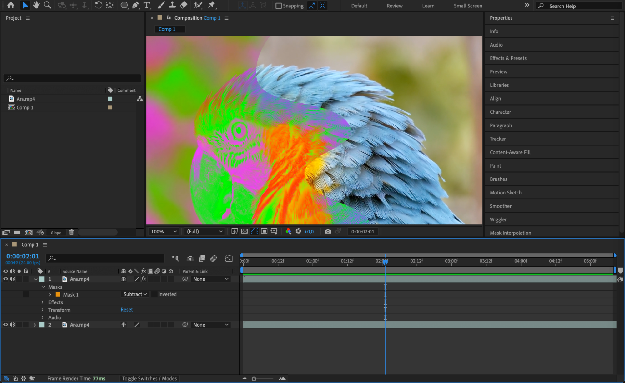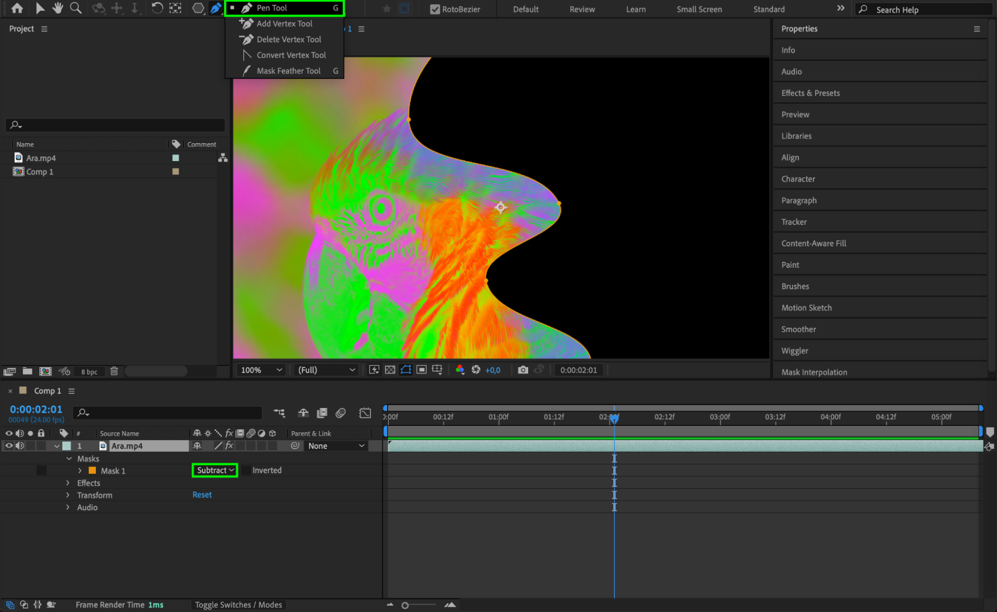 To apply color inversion to specific areas of your layer, use masks. First, select your layer, then use the Pen Tool (G) to draw a mask over the area you want to invert. Open the Mask Properties by clicking the arrow next to the mask name in the Timeline, and set the Mask Mode to Add (or Subtract if you want to invert everything except the masked area).