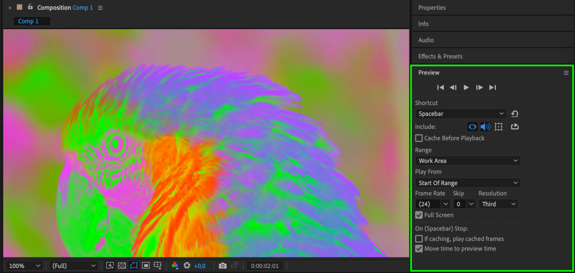 To see how the color inversion looks in action, press the Spacebar to preview. Check that the timing, animation, and blending match your intended design. You may need to fine-tune the keyframes or mask to achieve the perfect look.