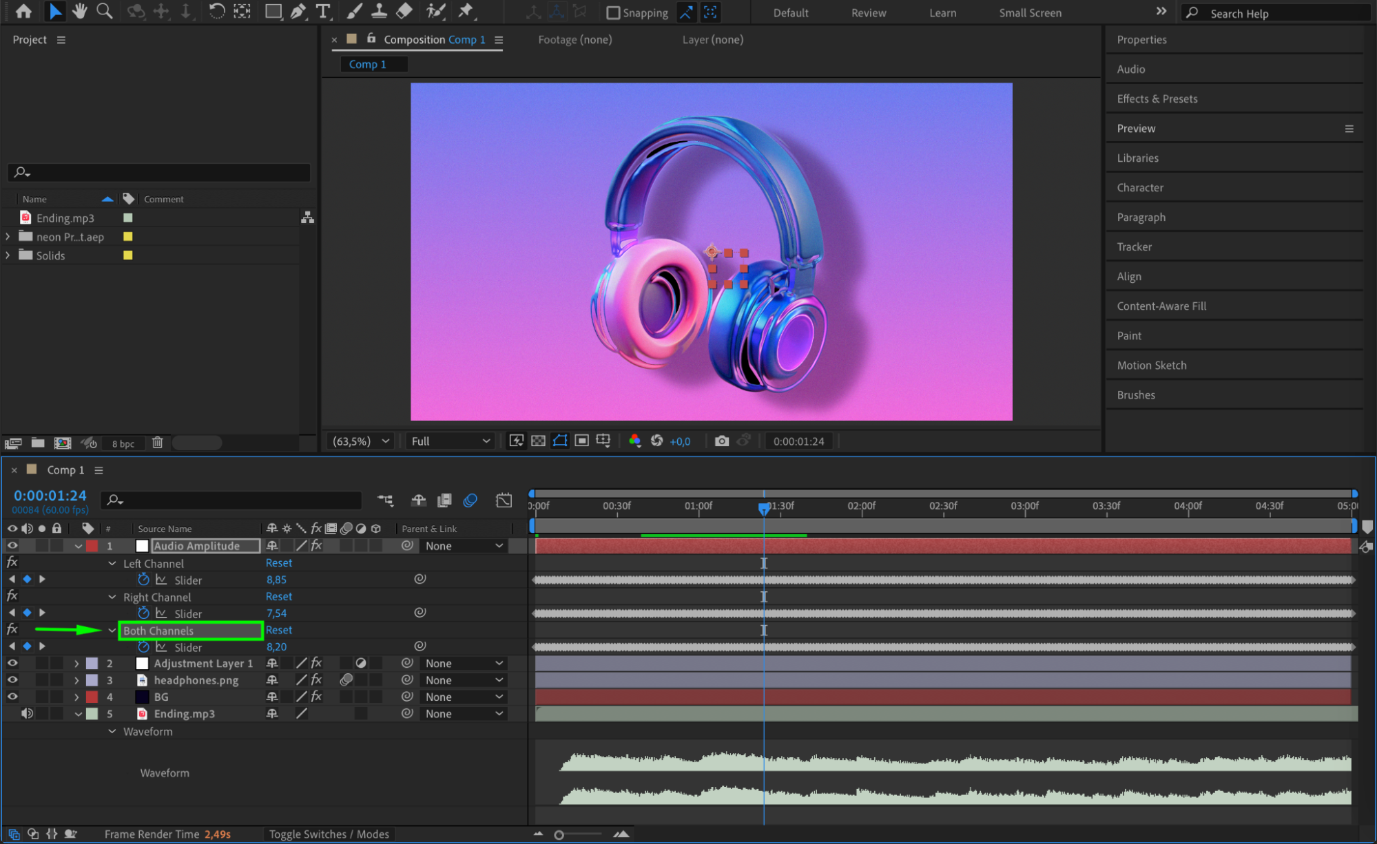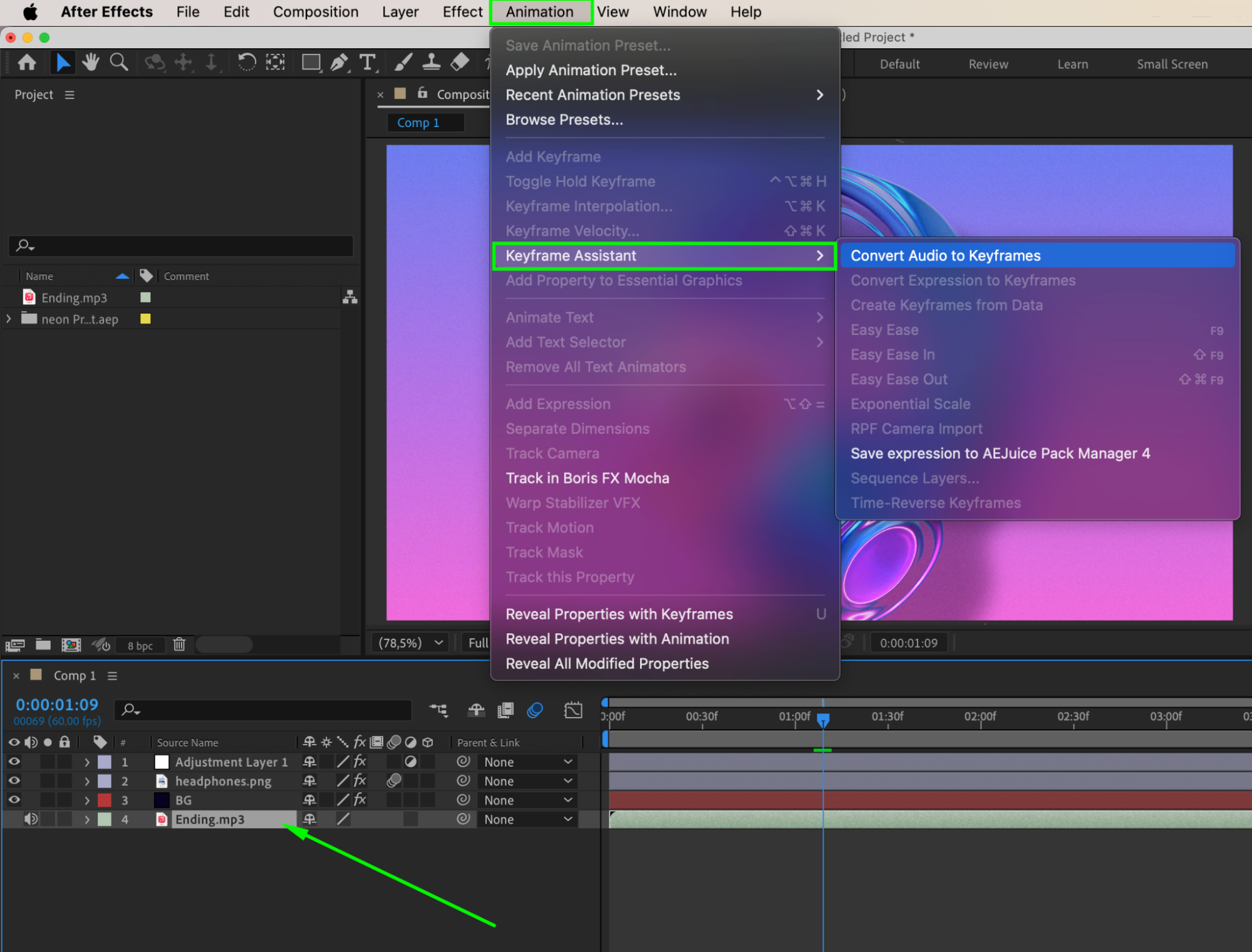 Select your audio layer, then go to Animation > Keyframe Assistant > Convert Audio to Keyframes. After Effects will generate a new null layer named Audio Amplitude, which contains three properties: Left Channel, Right Channel, and Both Channels. These represent the volume changes over time and will serve as the base for beat detection.