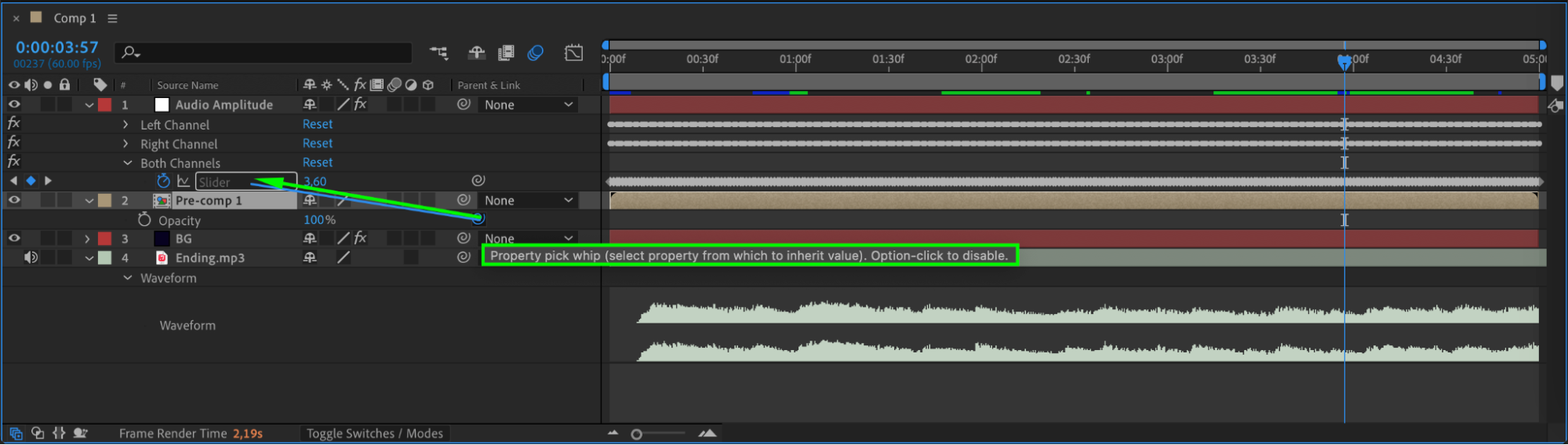 Choose the property you want to animate (e.g., Scale, Opacity, or Rotation) and Alt-click (or Option-click on Mac) the stopwatch next to it to open the expression field. Use the Pick Whip tool to drag from the expression box to the Both Channels > Slider on the Audio Amplitude layer. This will connect your animation directly to the audio levels.