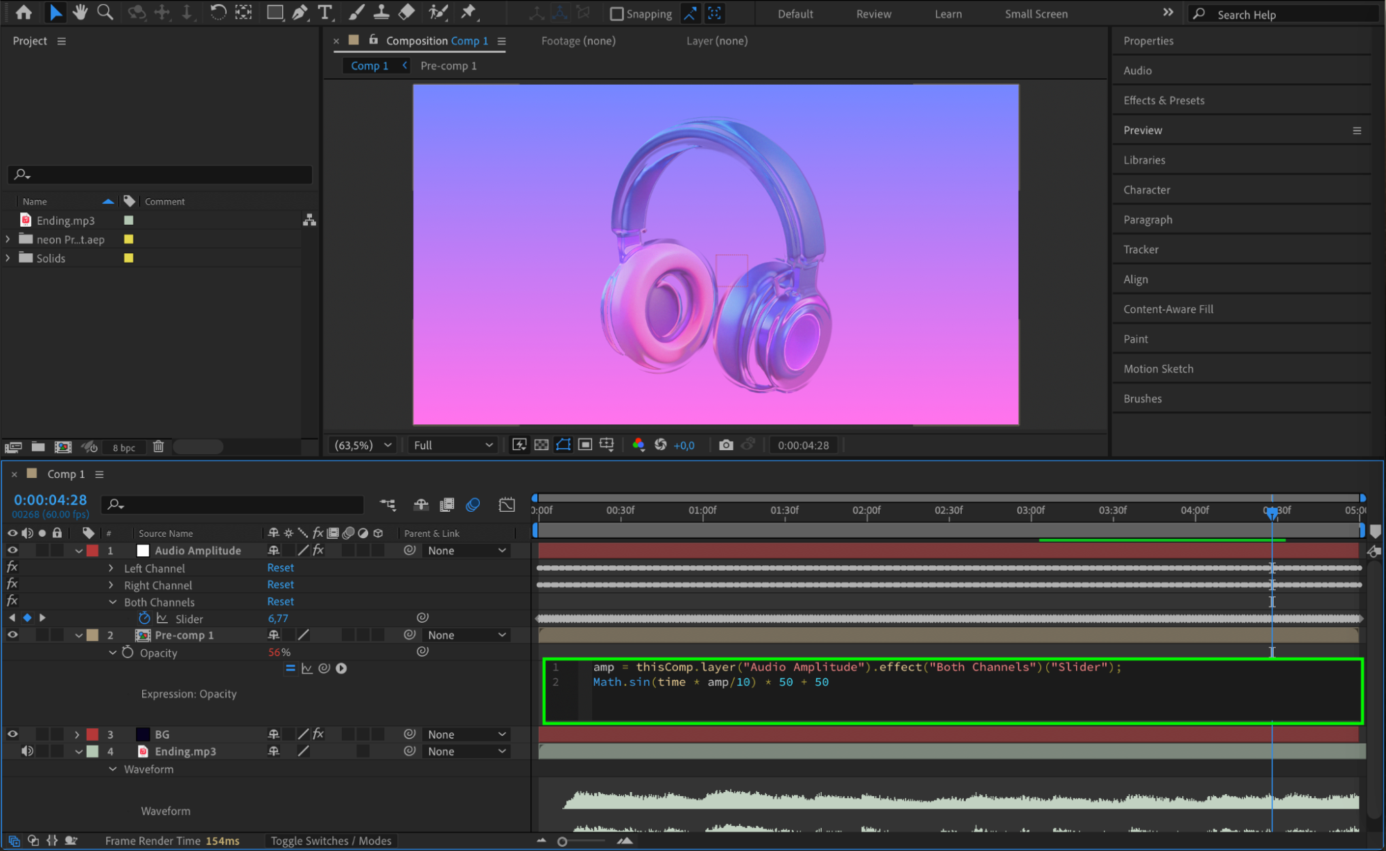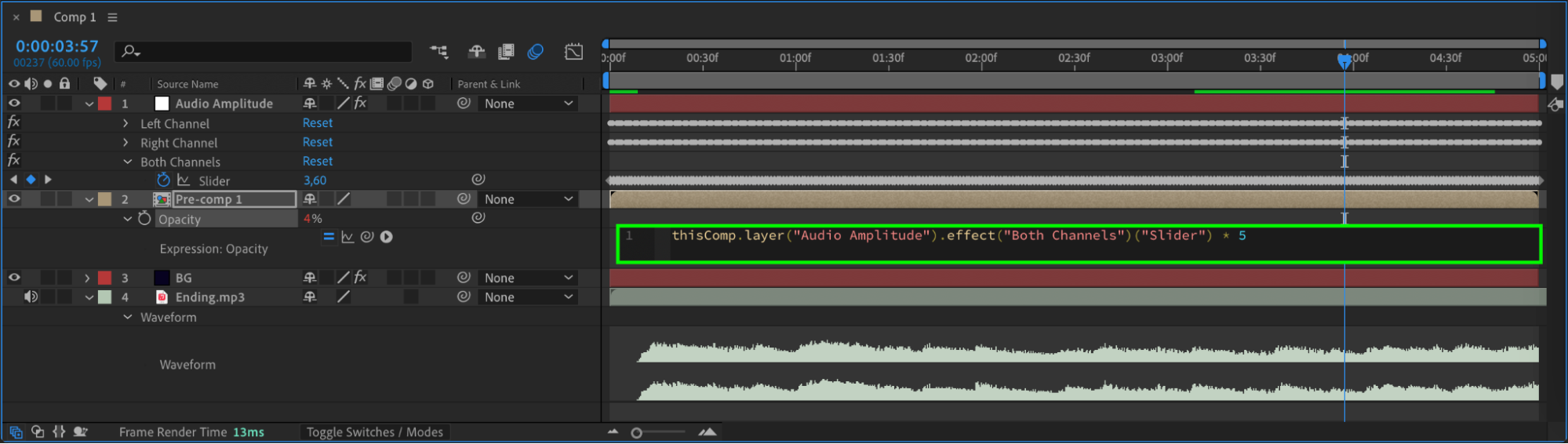 This makes the property respond fluidly to the audio amplitude. The multiplier (* 5) increases the effect’s intensity. Adjust the number to fit the needs of your animation.