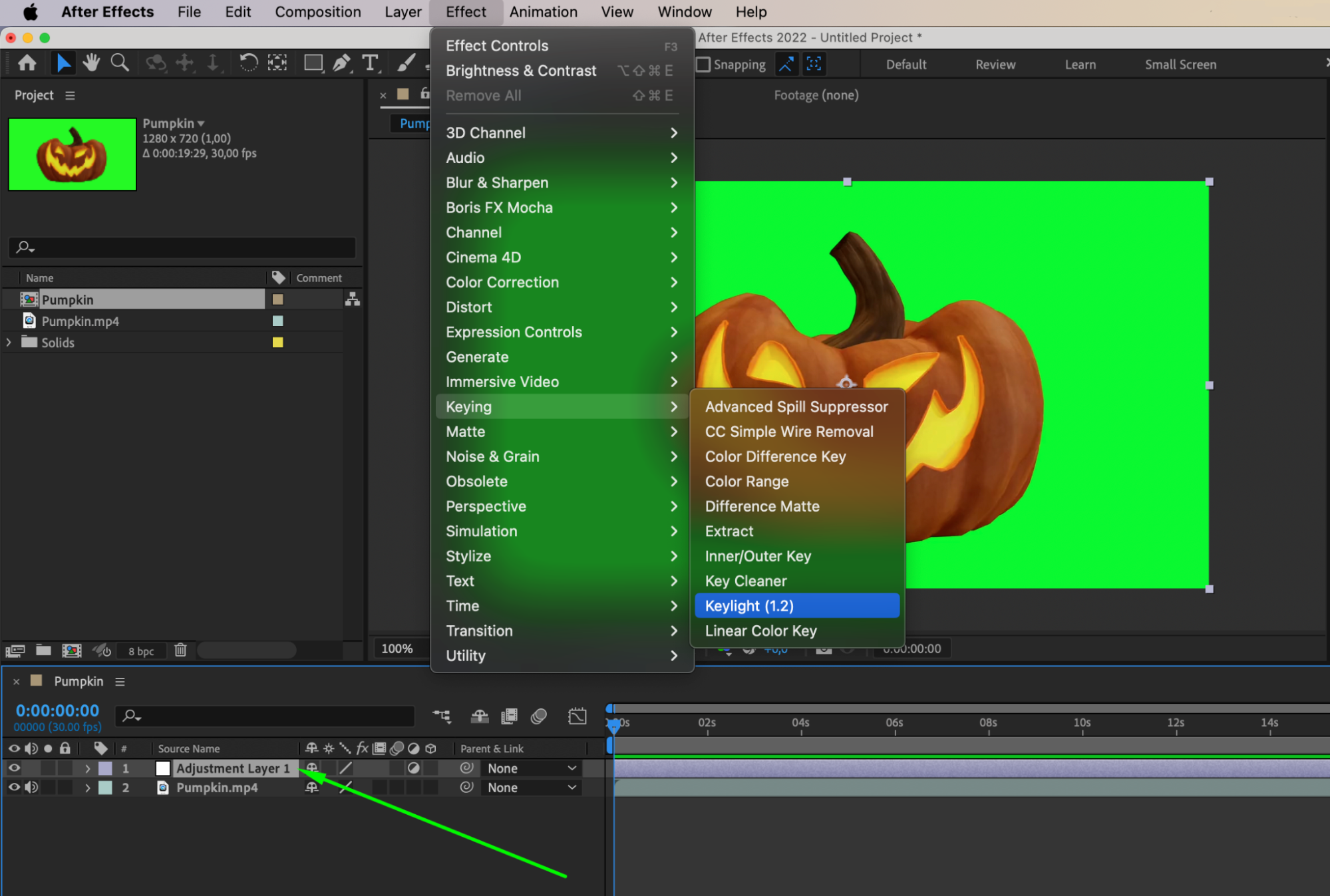 With the adjustment layer selected, go to Effect, choose Keying, and select Keylight. Keylight is a powerful keying plugin that comes bundled with After Effects. It provides advanced settings and controls to achieve precise keying results.