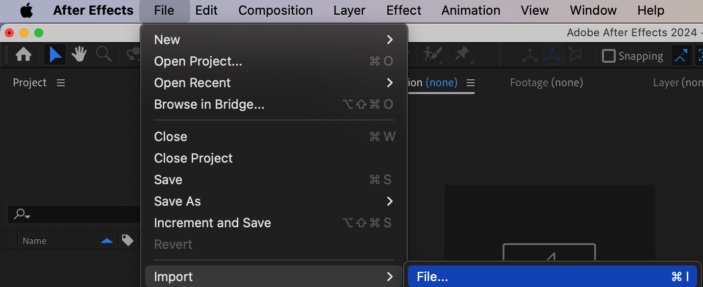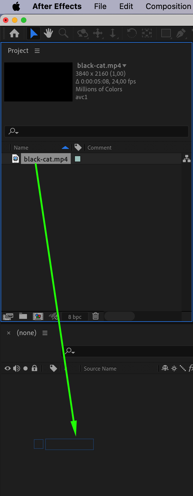Go to File > Import > File and select your video file. Drag it onto the Timeline Panel to begin working with it.