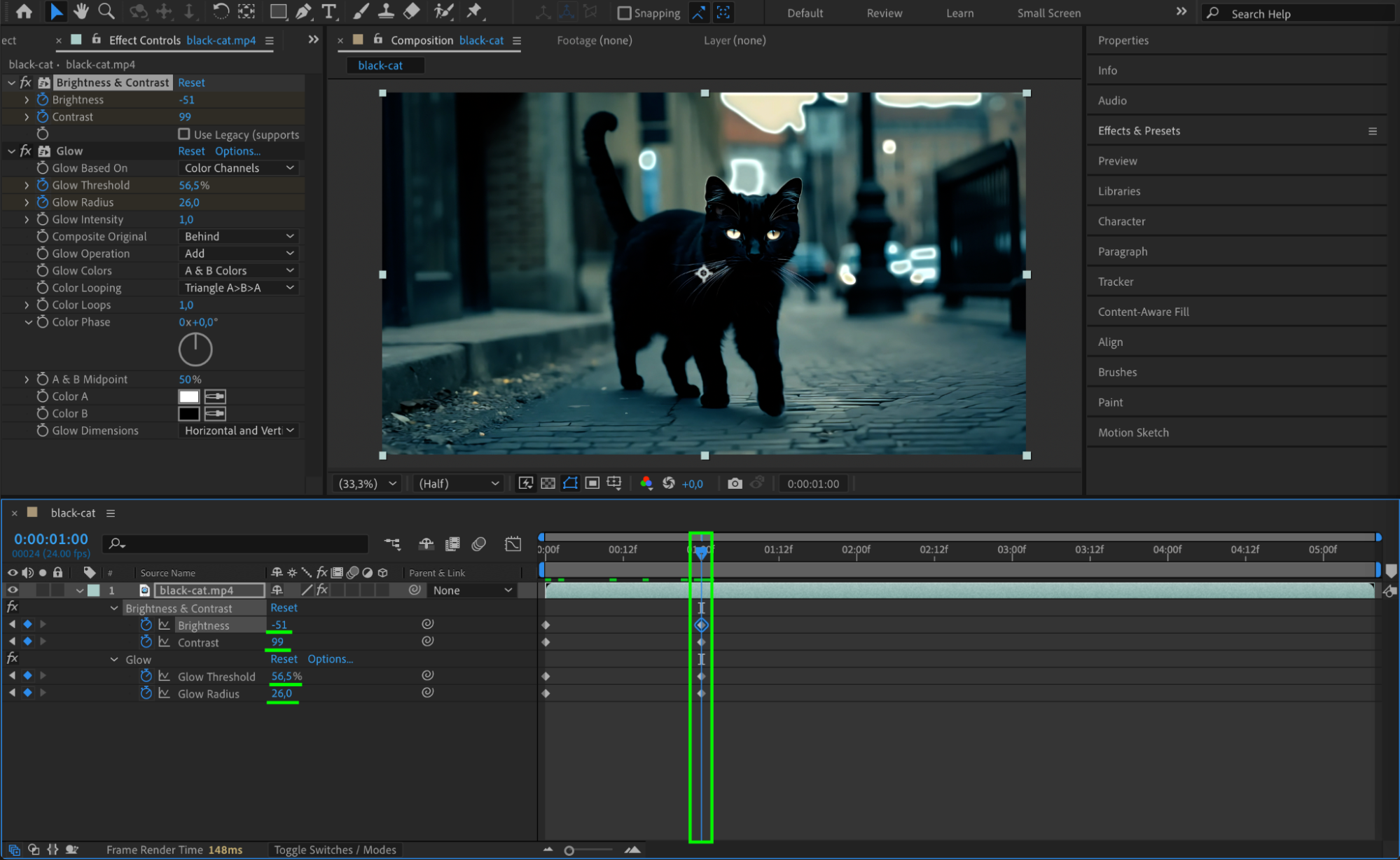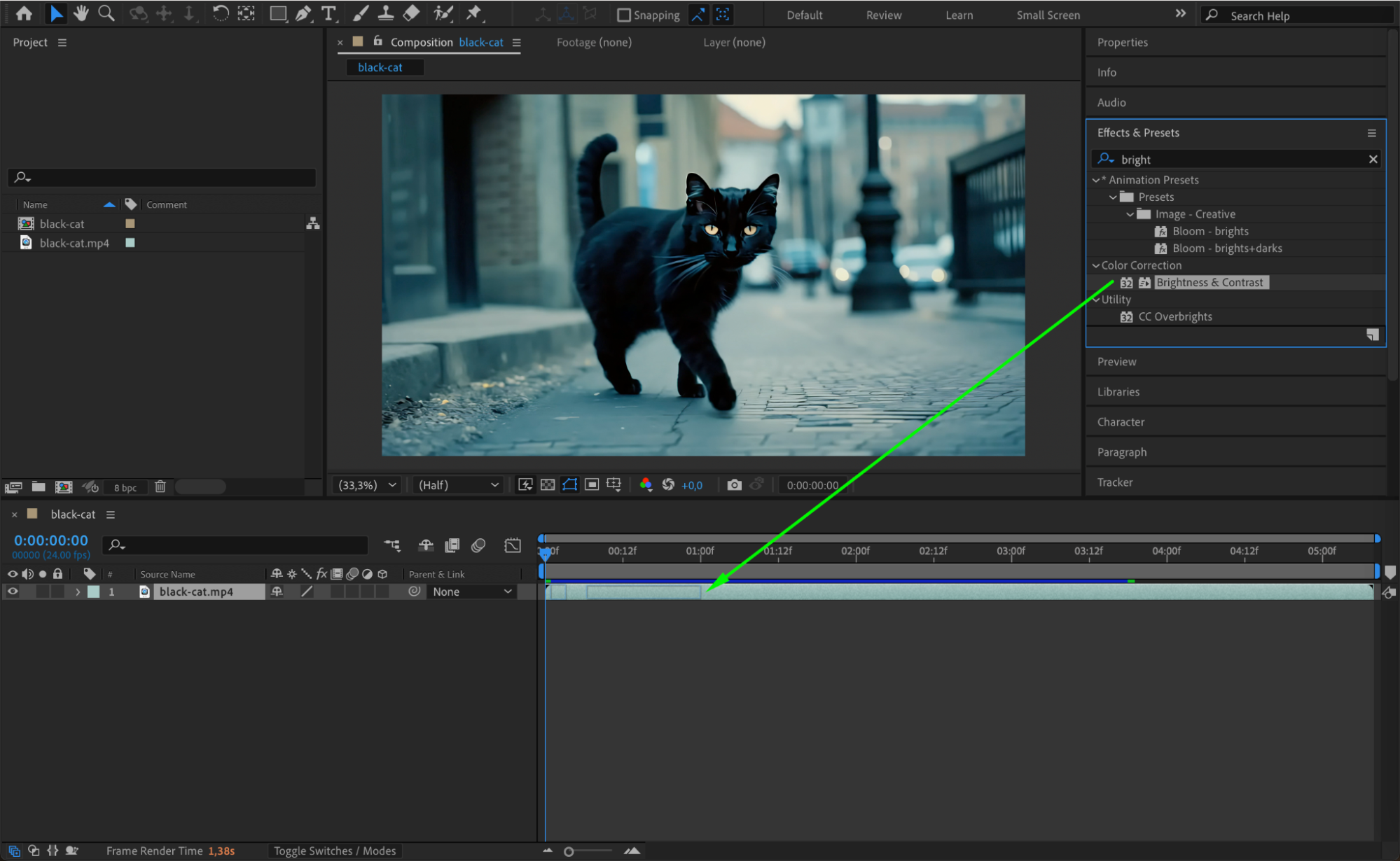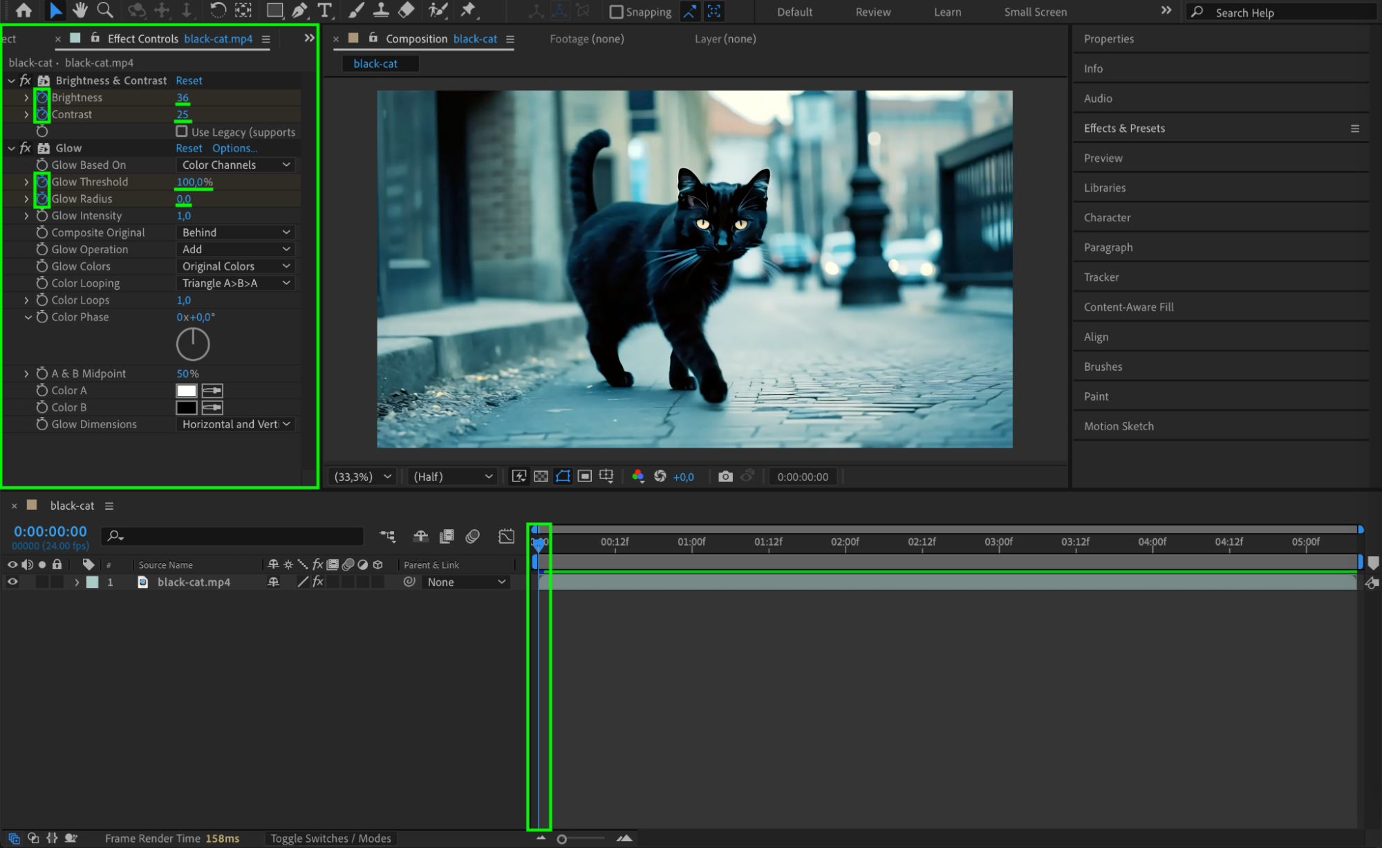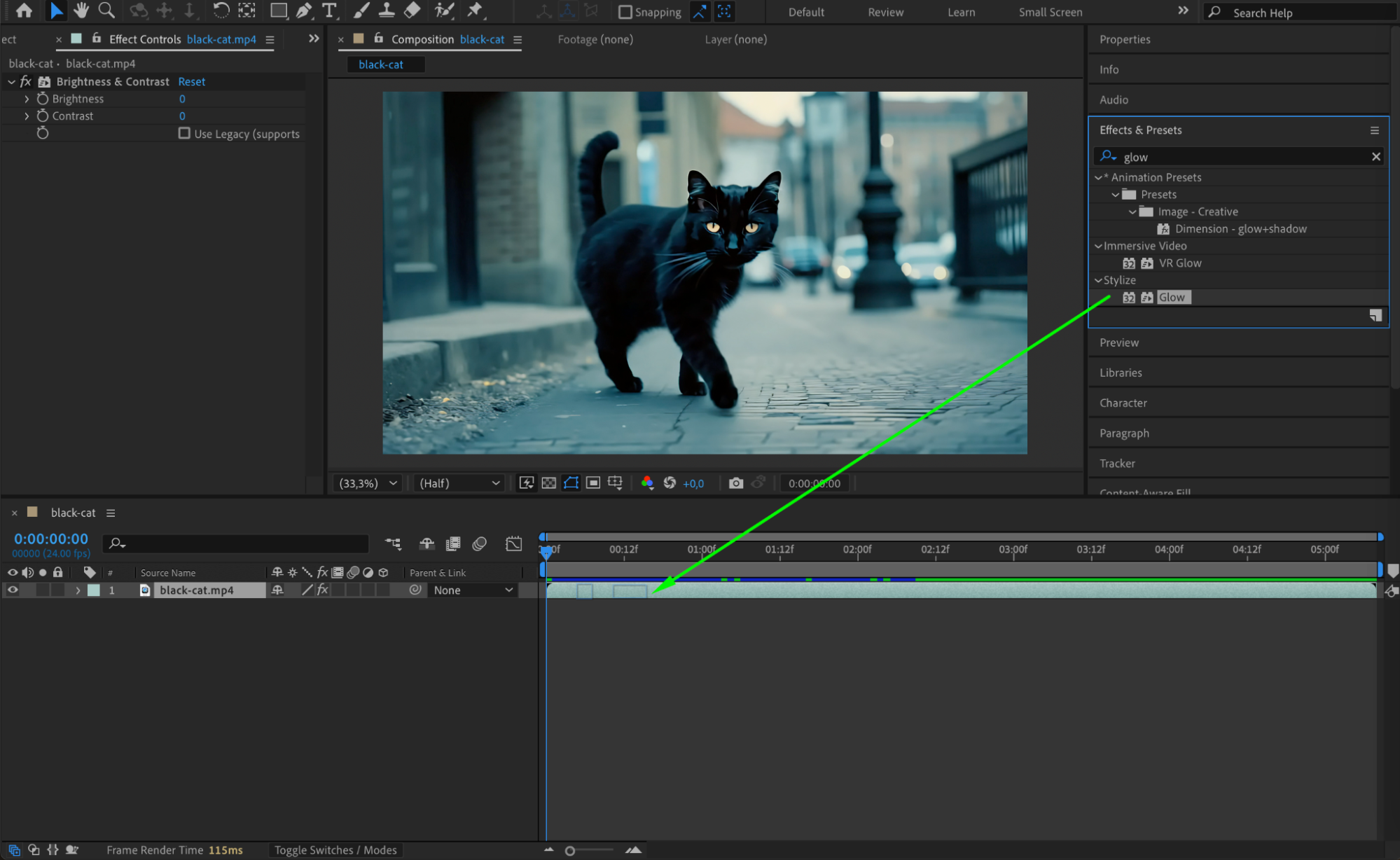 Open the Effects & Presets panel and drag the effects you want to use onto your video layer. For example, you can apply Brightness & Contrast or Glow to enhance your footage.