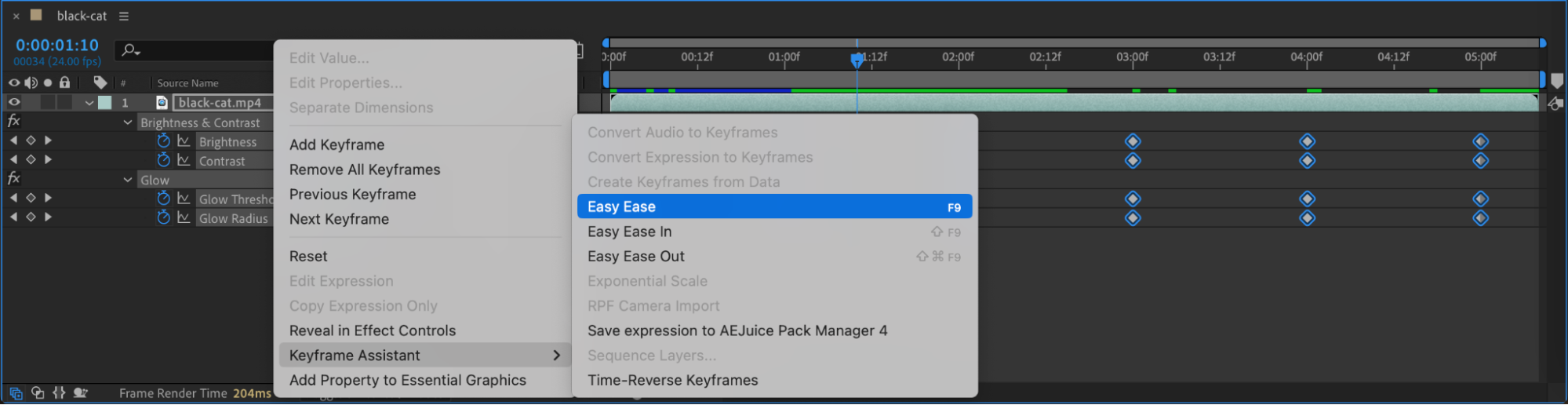 Press “U” to reveal all keyframes on your timeline. Move the CTI forward and change the effect values. A new keyframe will automatically be created, allowing the effect to transition smoothly between values.