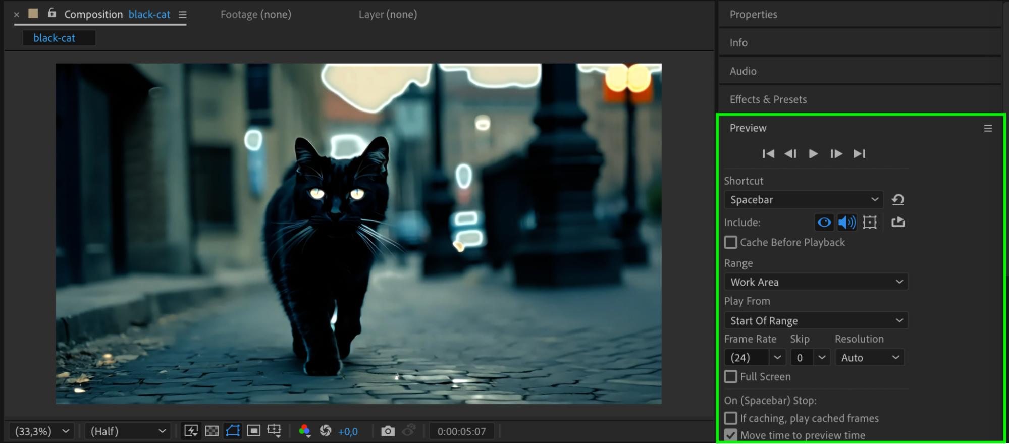 Press Spacebar to preview your animation. Make sure the effect transitions smoothly between keyframes. If needed, adjust keyframe positions or values for a better result.