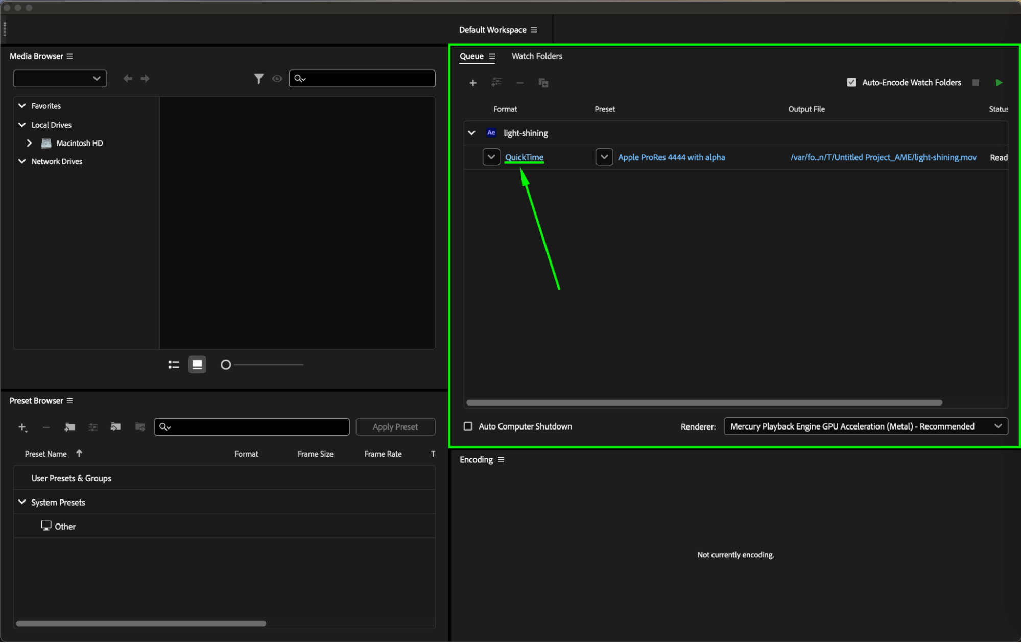 After Adobe Media Encoder opens, you will see your composition in the queue. To open the export settings, click on the format name displayed in the “Format” column next to your composition. This will allow you to customize various output settings, such as the file format (e.g., MP4, MOV), video codec, resolution, frame rate, and bit rate. Adjust these settings to ensure that your final output meets the required quality and format for your project.