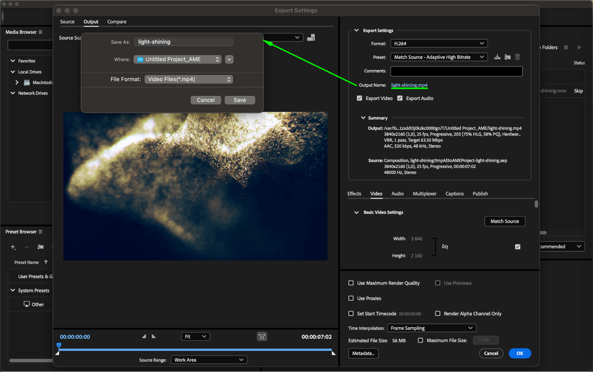 Next, specify the destination folder where you want to save your rendered file. Click on the “Output Name” link and choose your preferred file location. This ensures that your file is stored in an organized manner and easy to find after the rendering is complete.