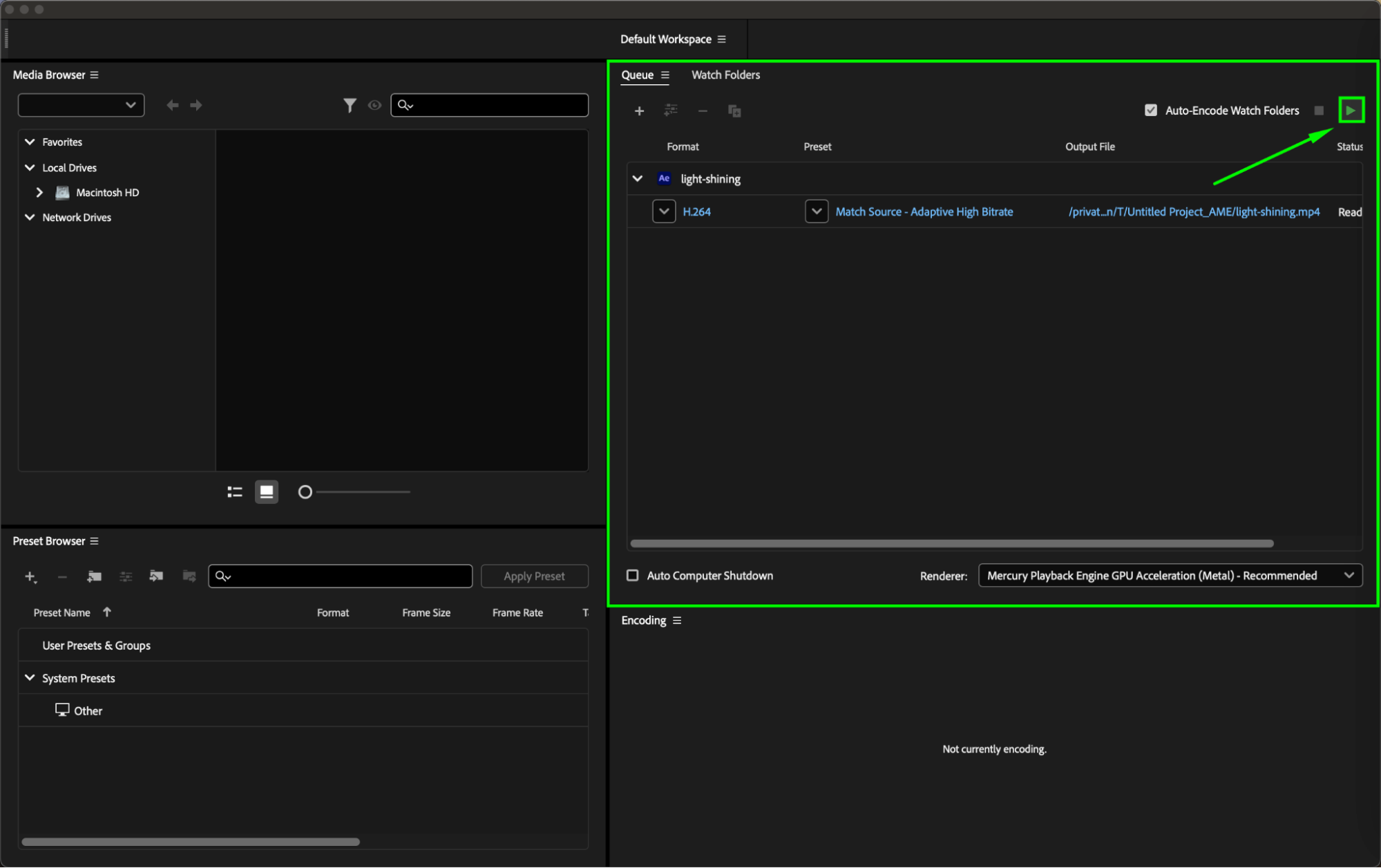 Once all your settings are in place, press the “Play” button located at the top right corner of the Media Encoder Queue panel to start the rendering process. Adobe Media Encoder will begin encoding the file based on the composition you’ve added from After Effects. You can monitor the progress in the queue, including the estimated time remaining, status, and any additional details about the export.