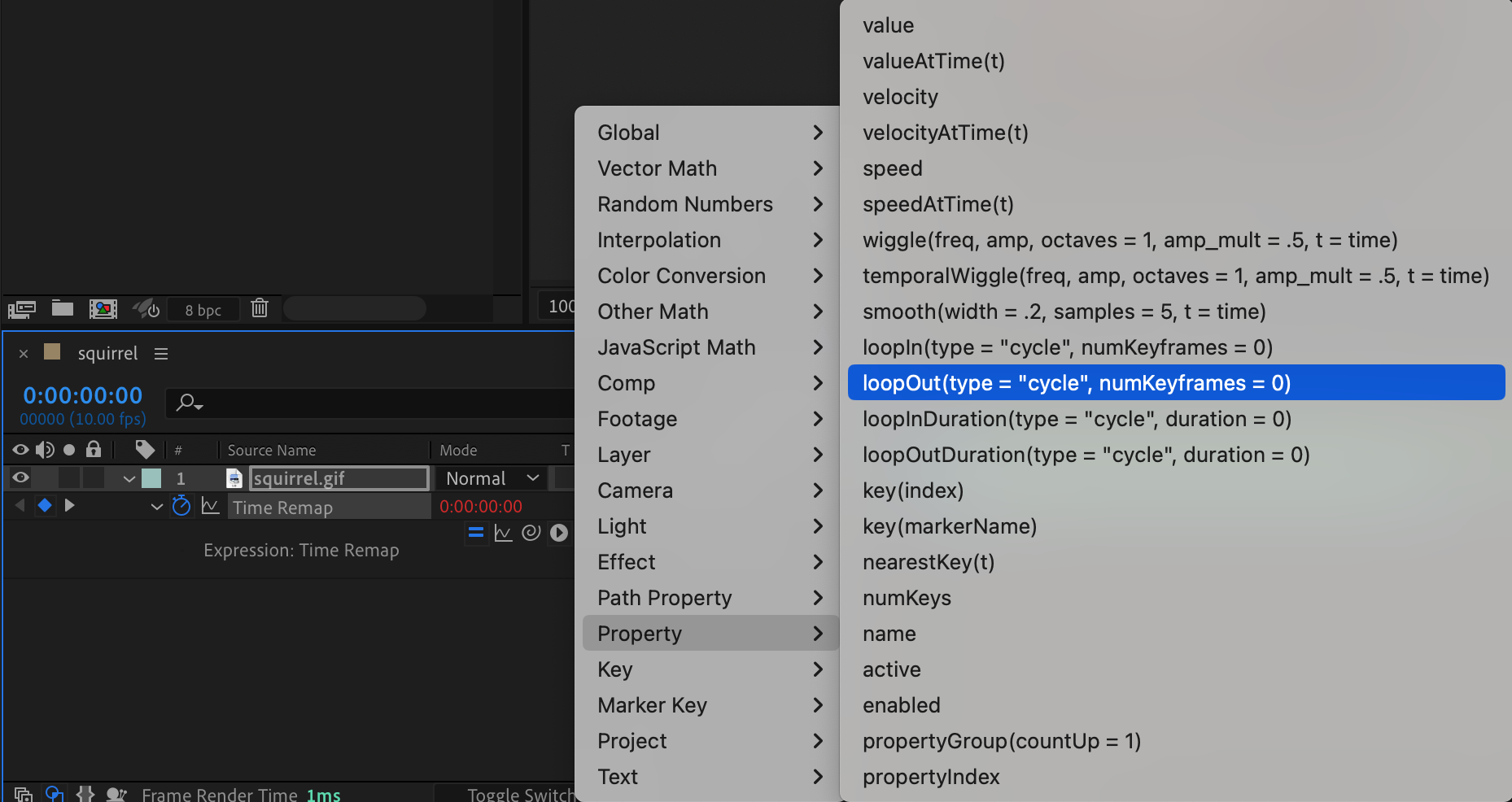 Click on the small triangle to open the expression options and select Property > LoopOut from the submenu.