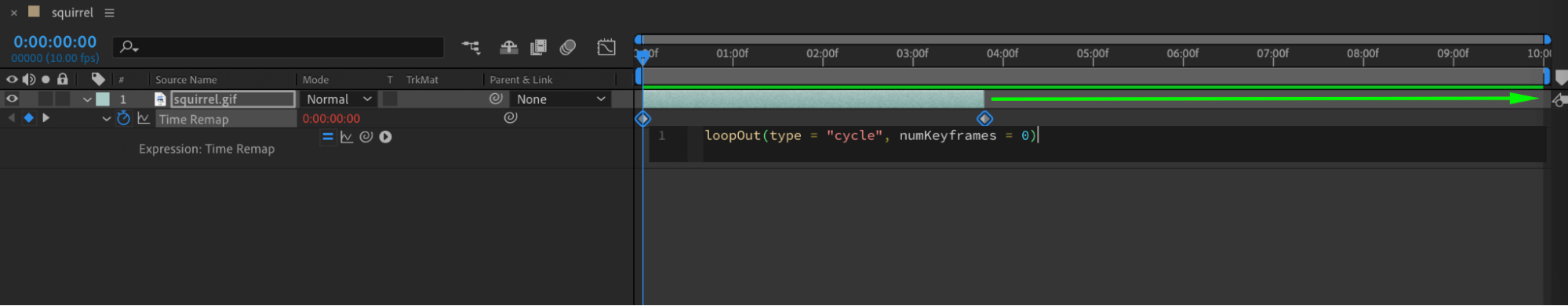 You will see the expression automatically added in the expression field. Press Enter, then right-click on the layer’s end and drag it to the right to extend its duration.