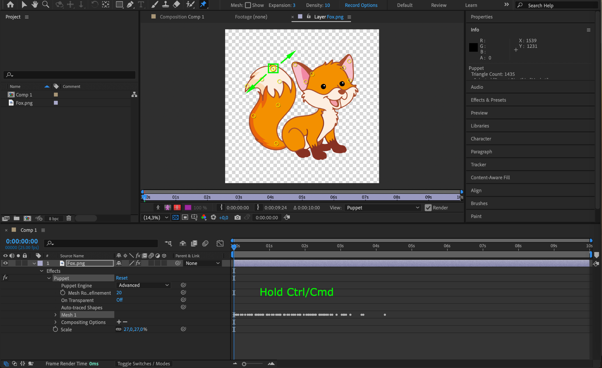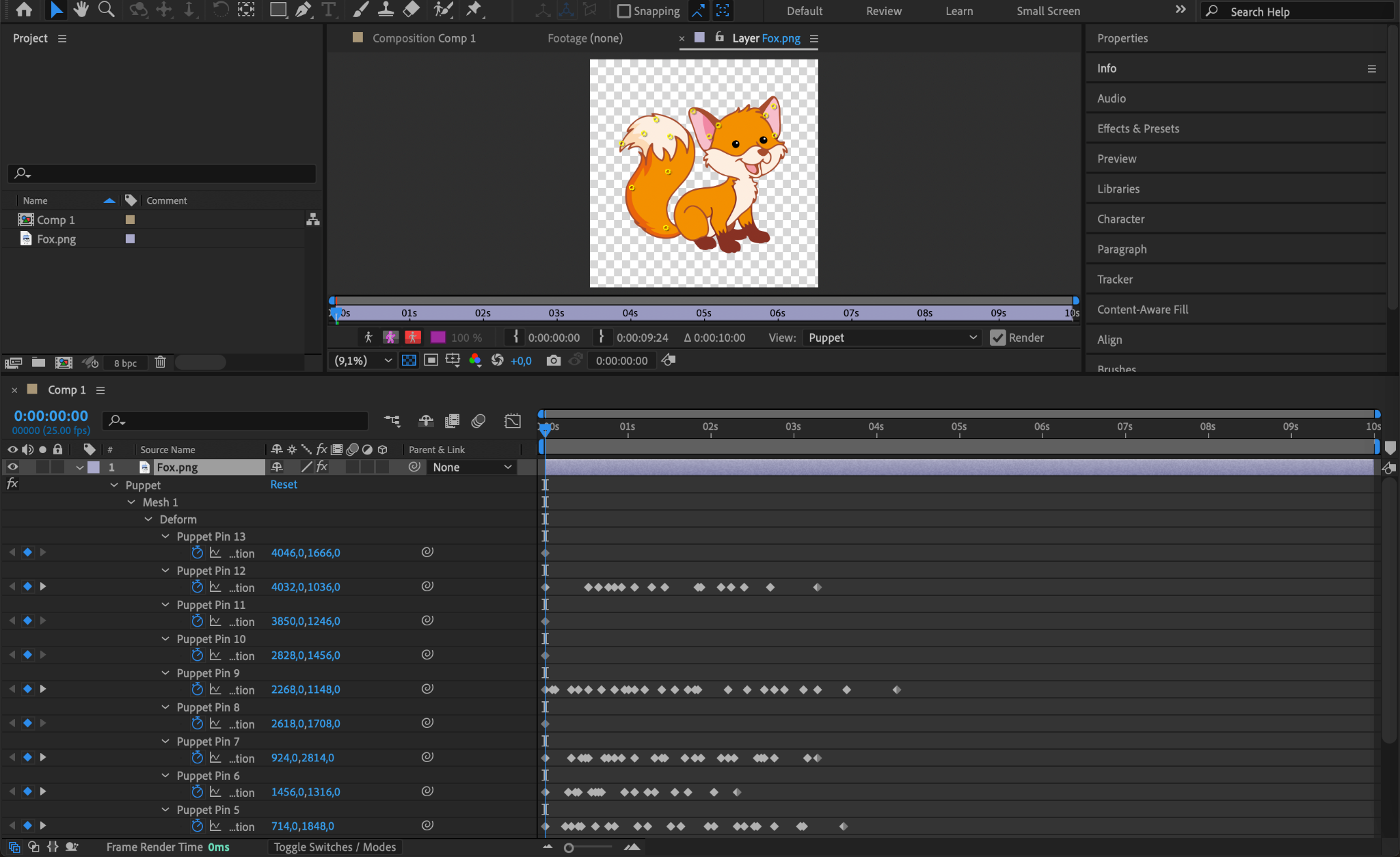 Hold Ctrl/Cmd and drag the Puppet Pins to create movement. The Current Time Indicator (CTI) will automatically advance as you adjust the pins, recording keyframes for each movement. Repeat this for all pins you want to animate.