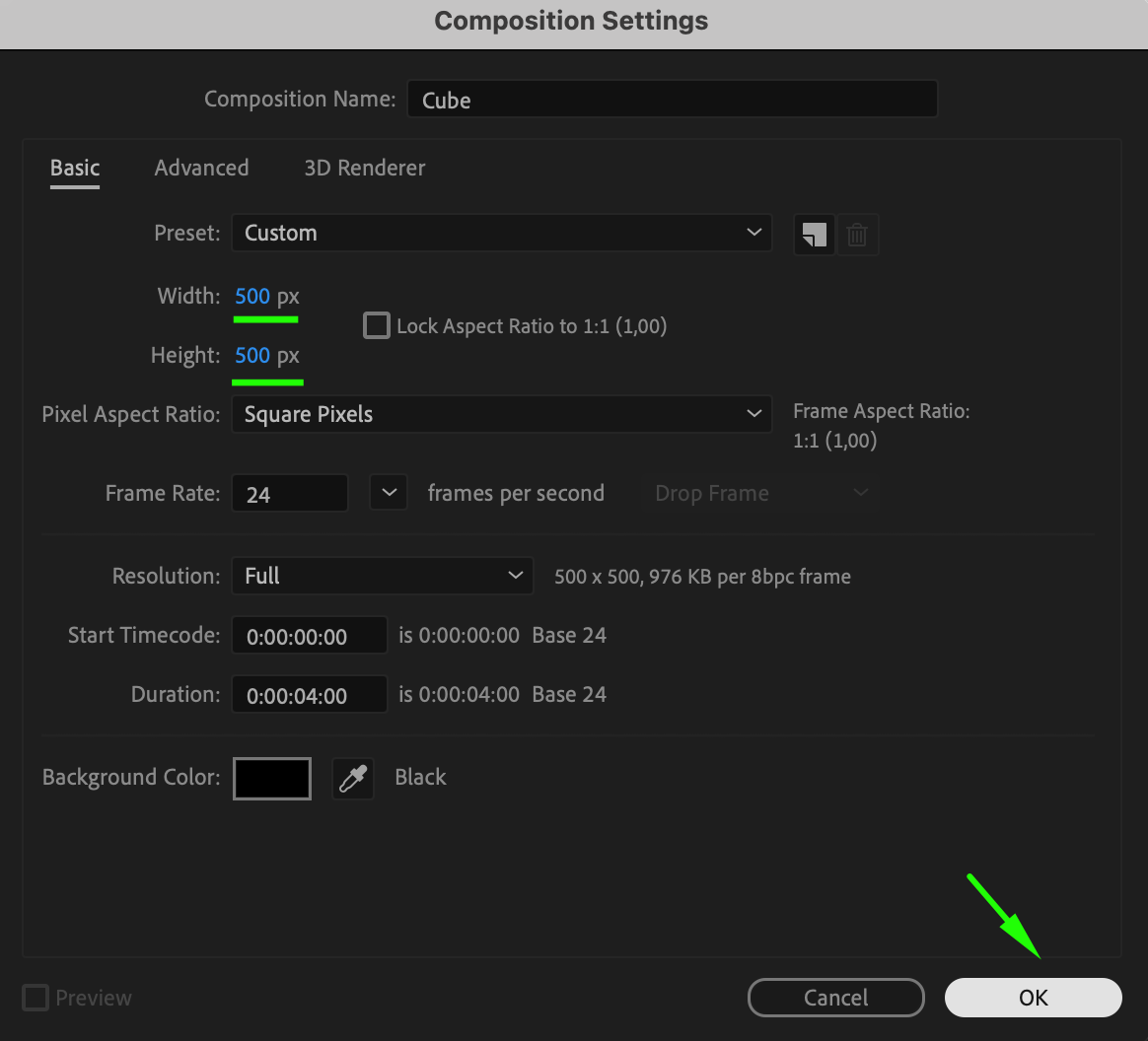 Go to Composition > New Composition, set the Width and Height to 500 pixels, and click OK. This composition will serve as one face of your cube.