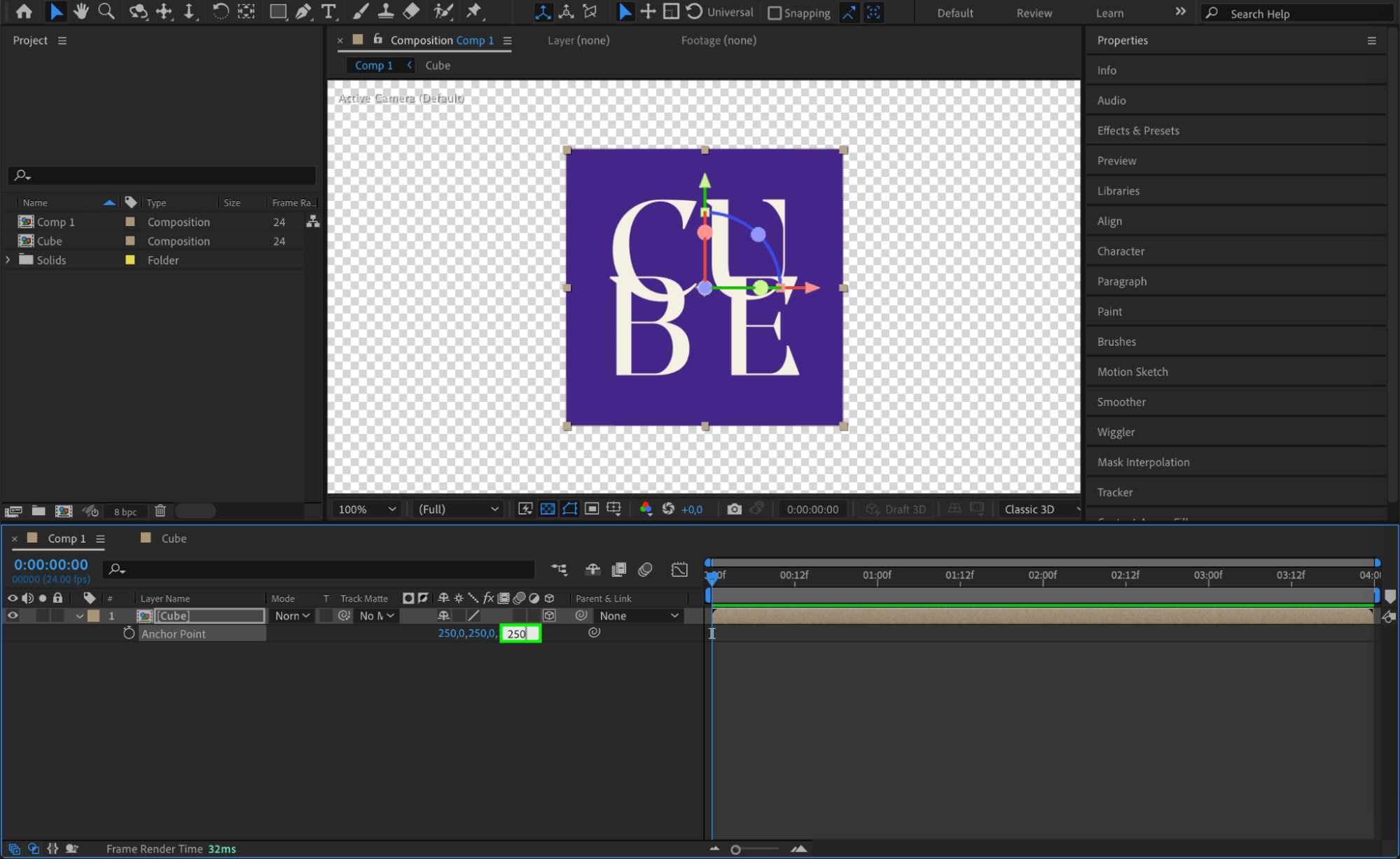 Press the hotkey “A” to open the Anchor Point property. Set the Z value to 250 to position the anchor point at the center of the face layer, which is essential for proper rotation.