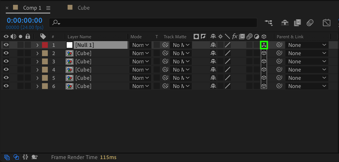 In the Parent & Link column of the Timeline Panel, set all cube face layers to be children of the null object. This allows the null object to control the rotation of all cube faces simultaneously.