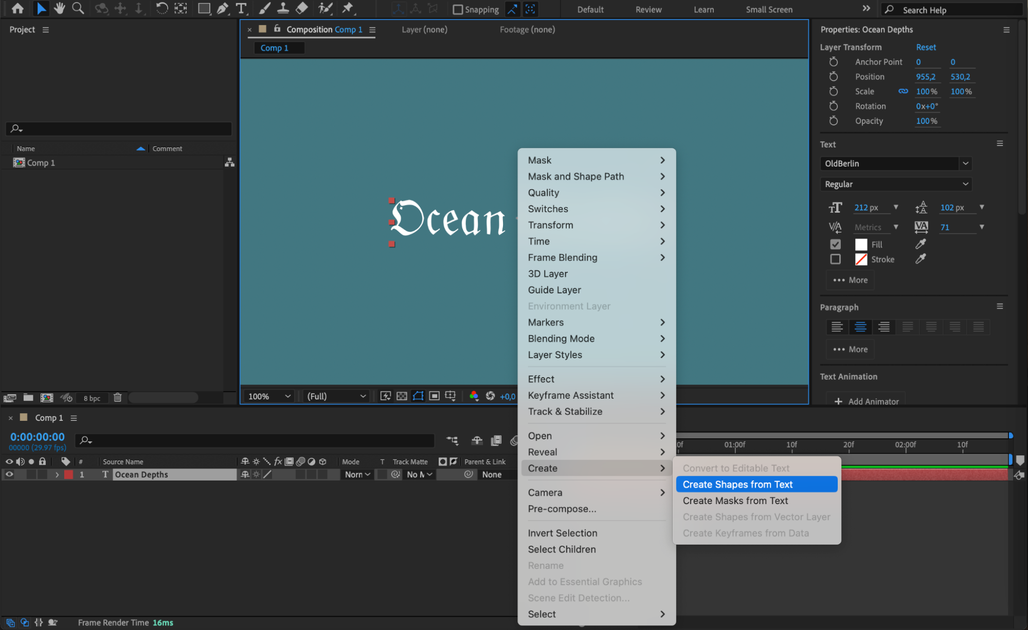 To start creating 3D effects, right-click the text layer in the timeline and choose Create > Create Shapes from Text. This will convert your text into a shape layer, which gives you more flexibility in manipulating the characters in 3D space. This conversion is essential to unlock 3D transformations.