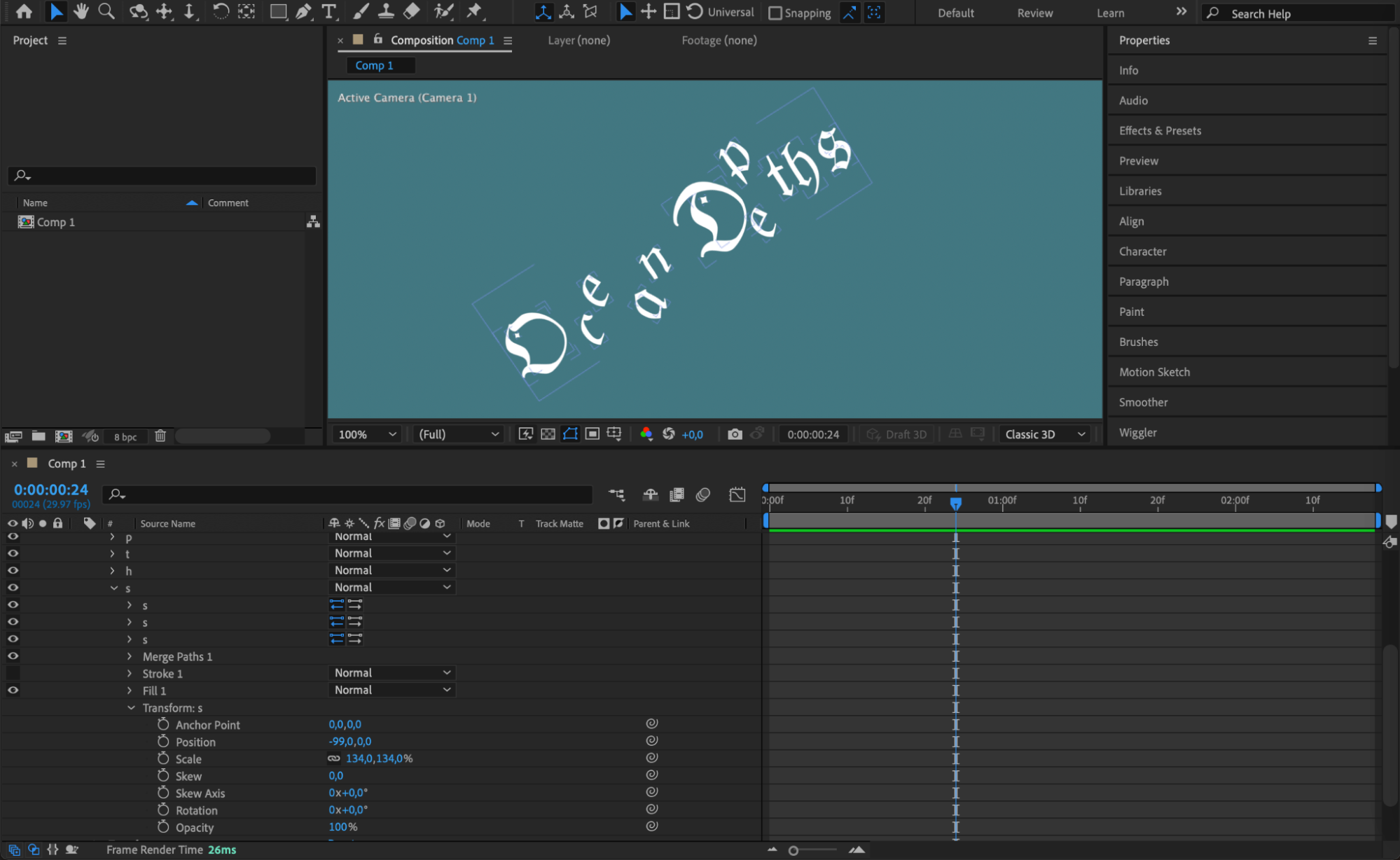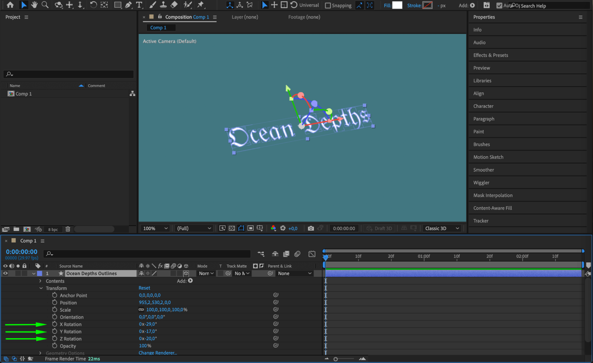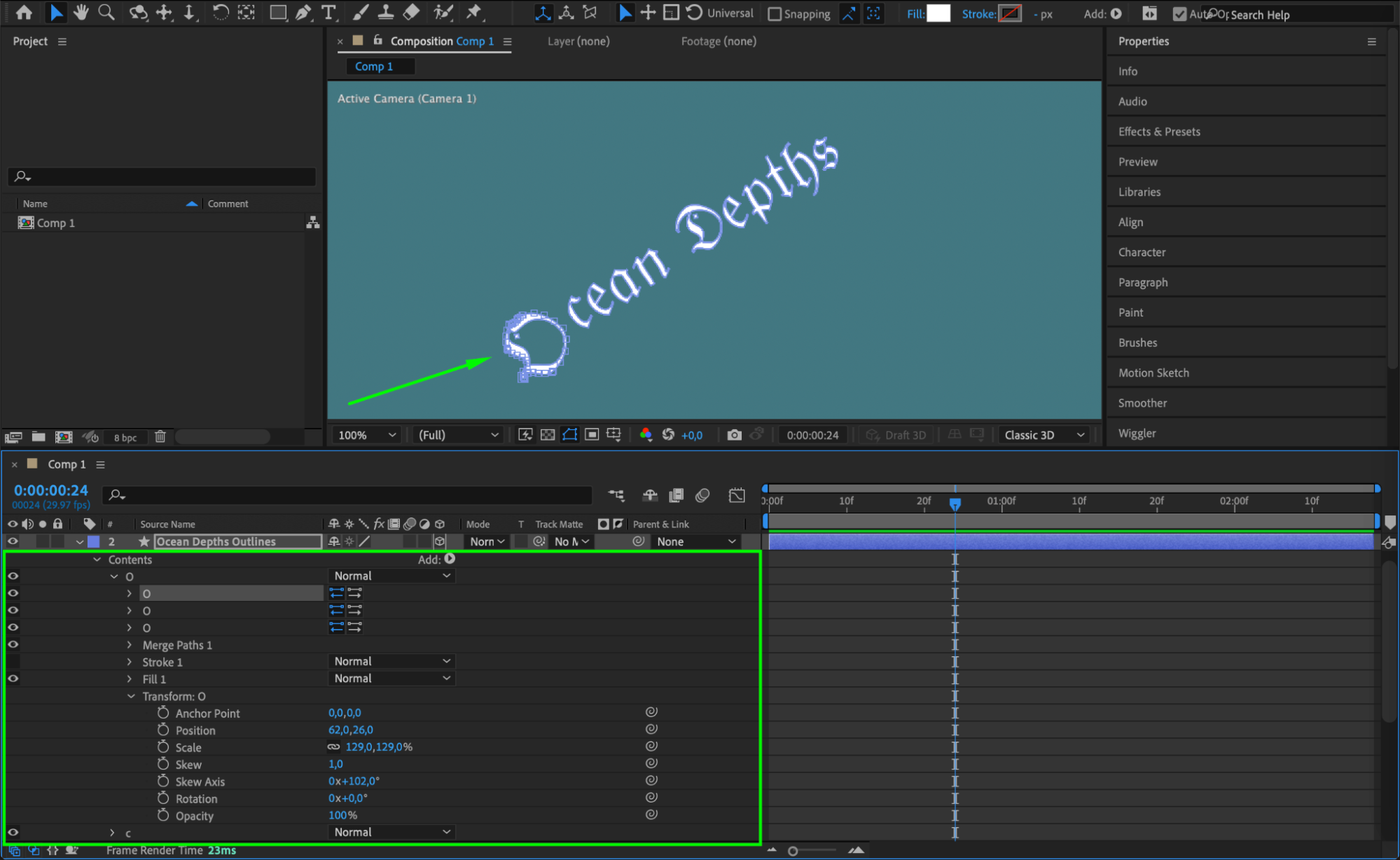 Expand the shape layer’s properties by clicking the arrow next to it. Under Contents, you can access each letter’s individual properties. Customize the position, rotation, and scale of each letter to create unique 3D effects. This lets you give each letter its own distinct style and layout in space.