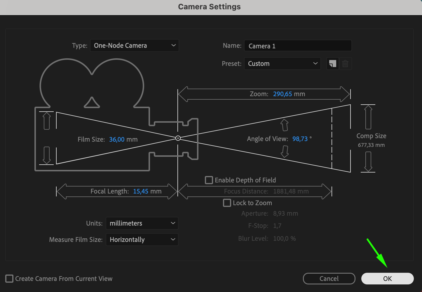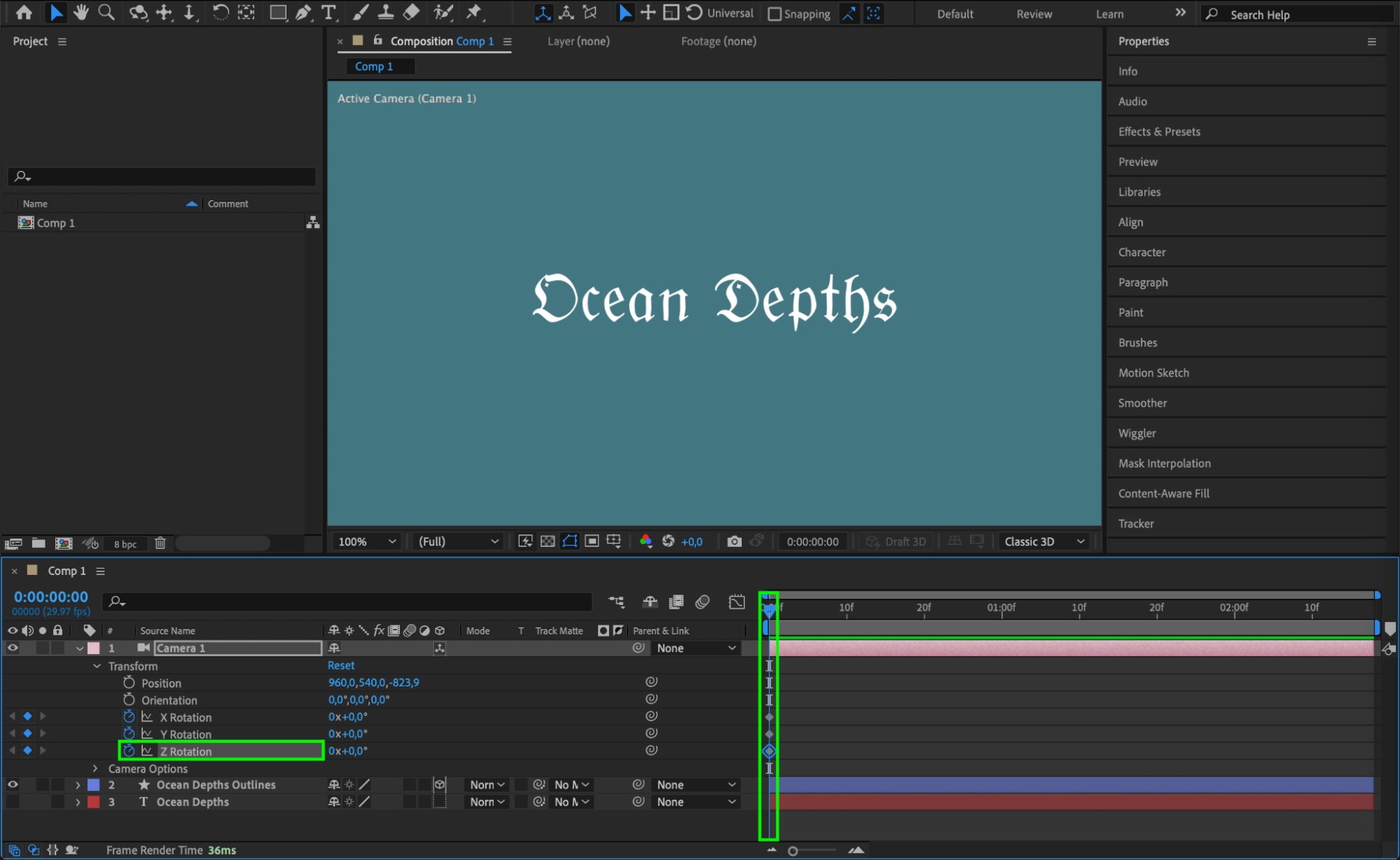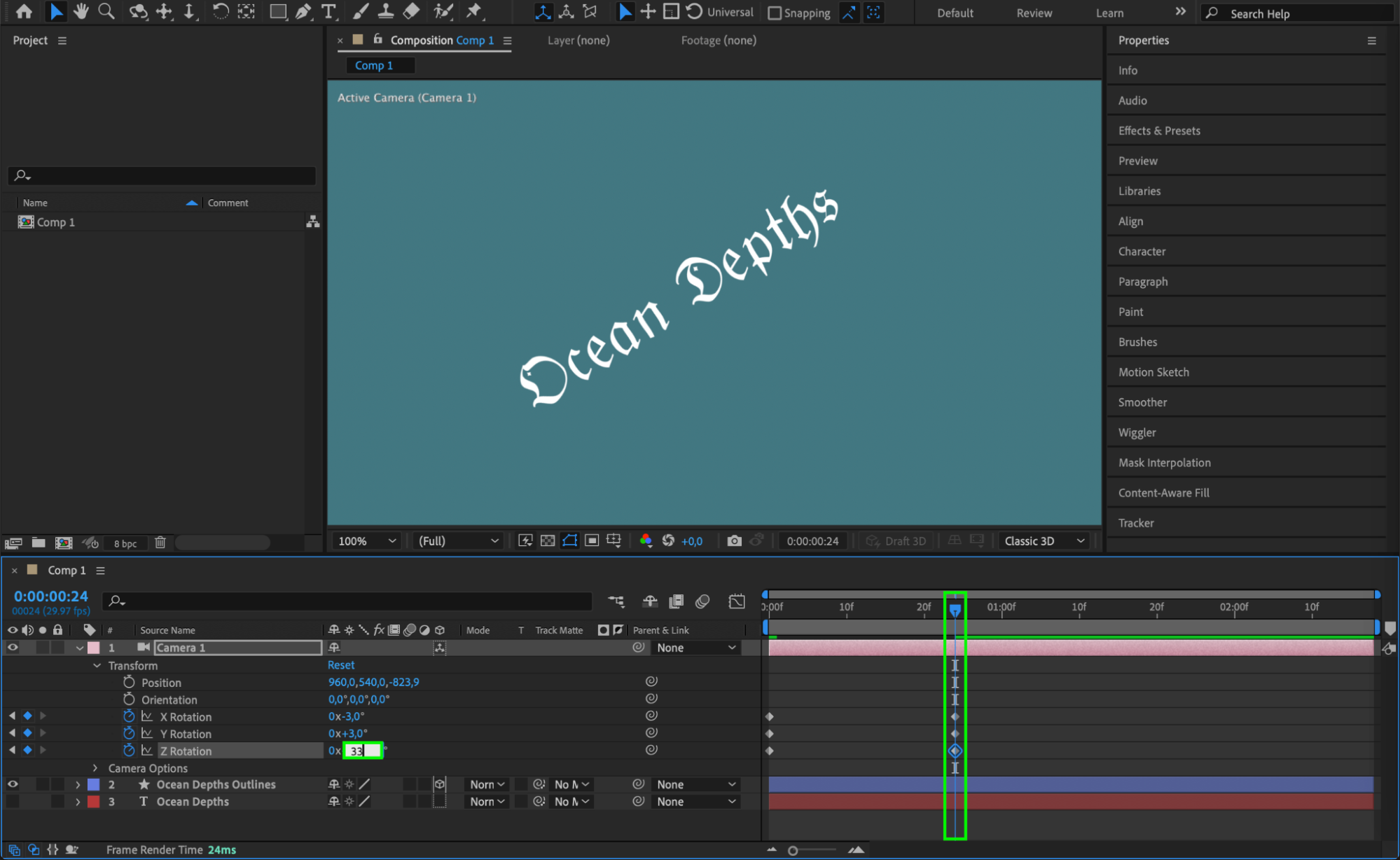 Now, go to Layer > New > Camera to add a camera to your composition. A camera layer allows you to view and move through your scene in 3D space. Adjust the camera’s settings (such as focal length and angle) to match your design vision. This layer helps create dynamic perspectives for your 3D letters.