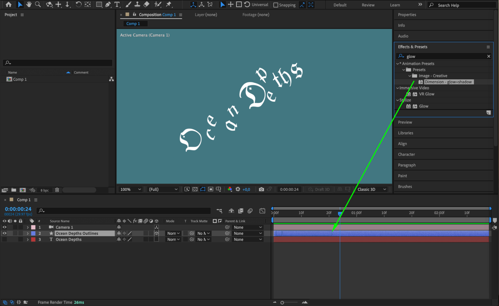 Open the Effects & Presets panel and search for relevant effects that you can apply to your 3D letters. Try effects like Bevel Alpha to add depth or Glow for visual enhancement. You can experiment with multiple effects to find the combination that makes your 3D text stand out.