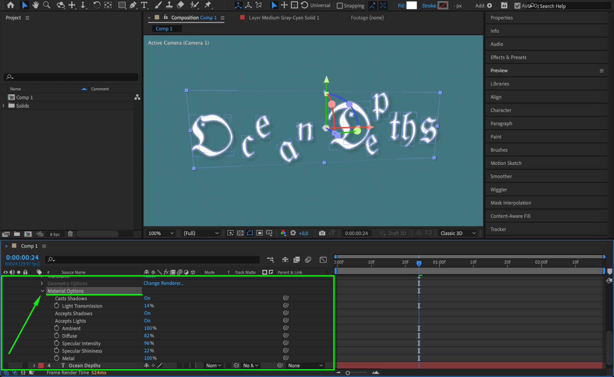 Under your text outlines layer, locate the Material Options section. Here, you can modify properties like Ambient, Diffuse, and Specular Intensity to make your letters look more realistic. These settings allow you to simulate lighting and surface reflections, enhancing the 3D illusion.