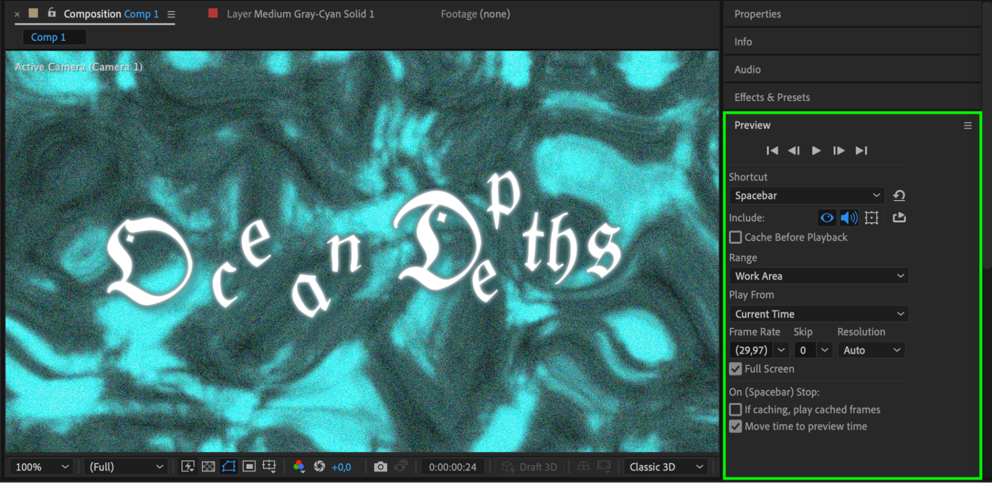 Once your 3D letters are set up, it’s time to preview the animation. Click the Play button to see how your camera moves and effects look in real time. Make adjustments as needed to fine-tune the appearance and motion of your 3D text before final rendering.
