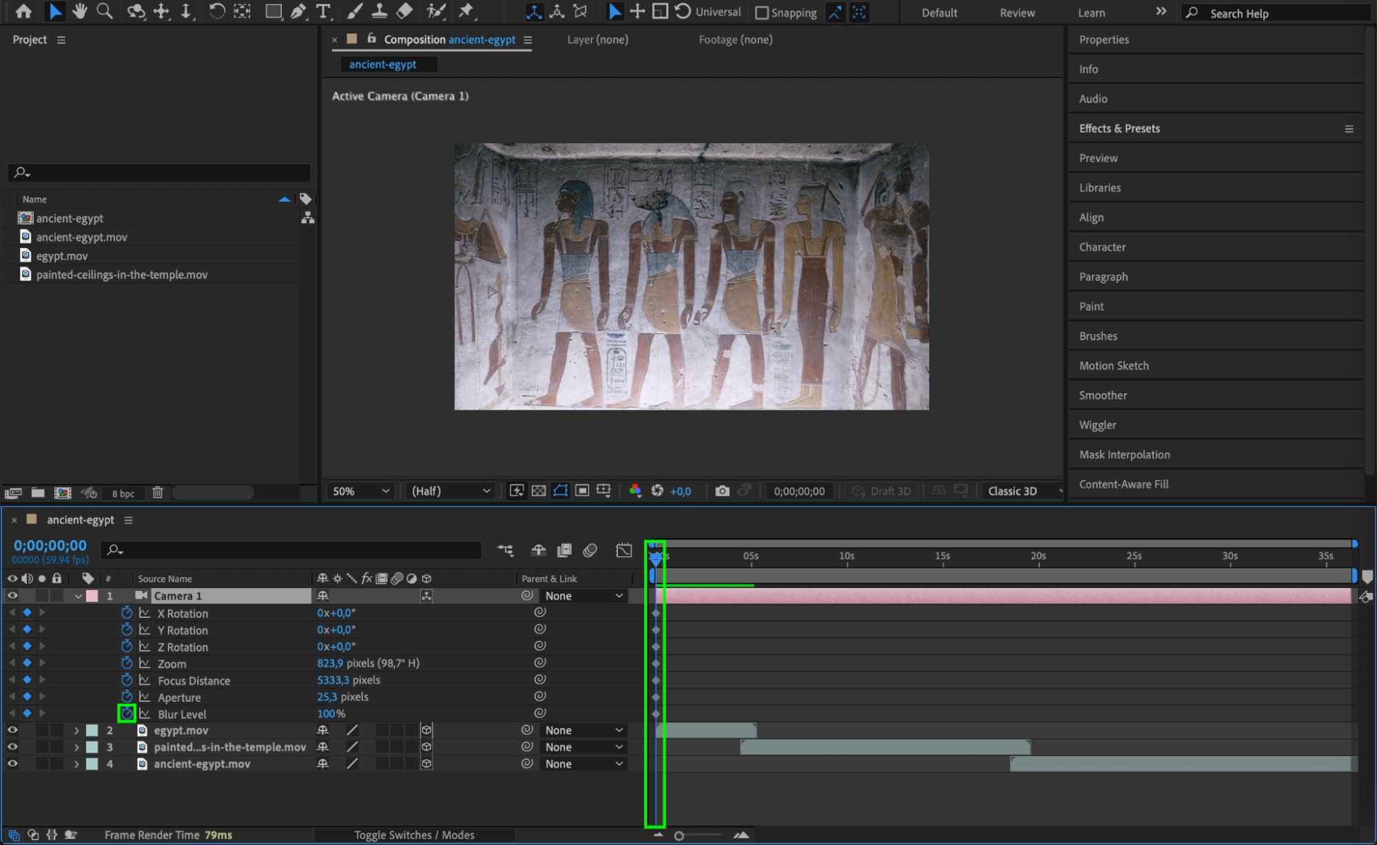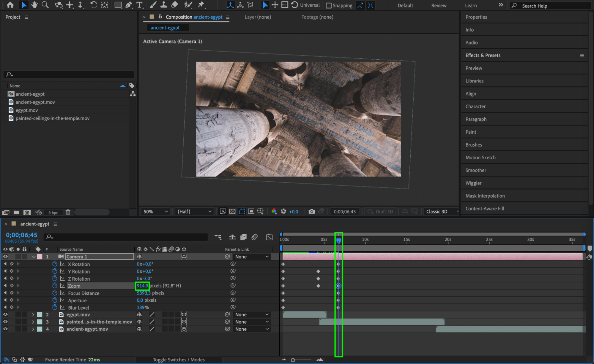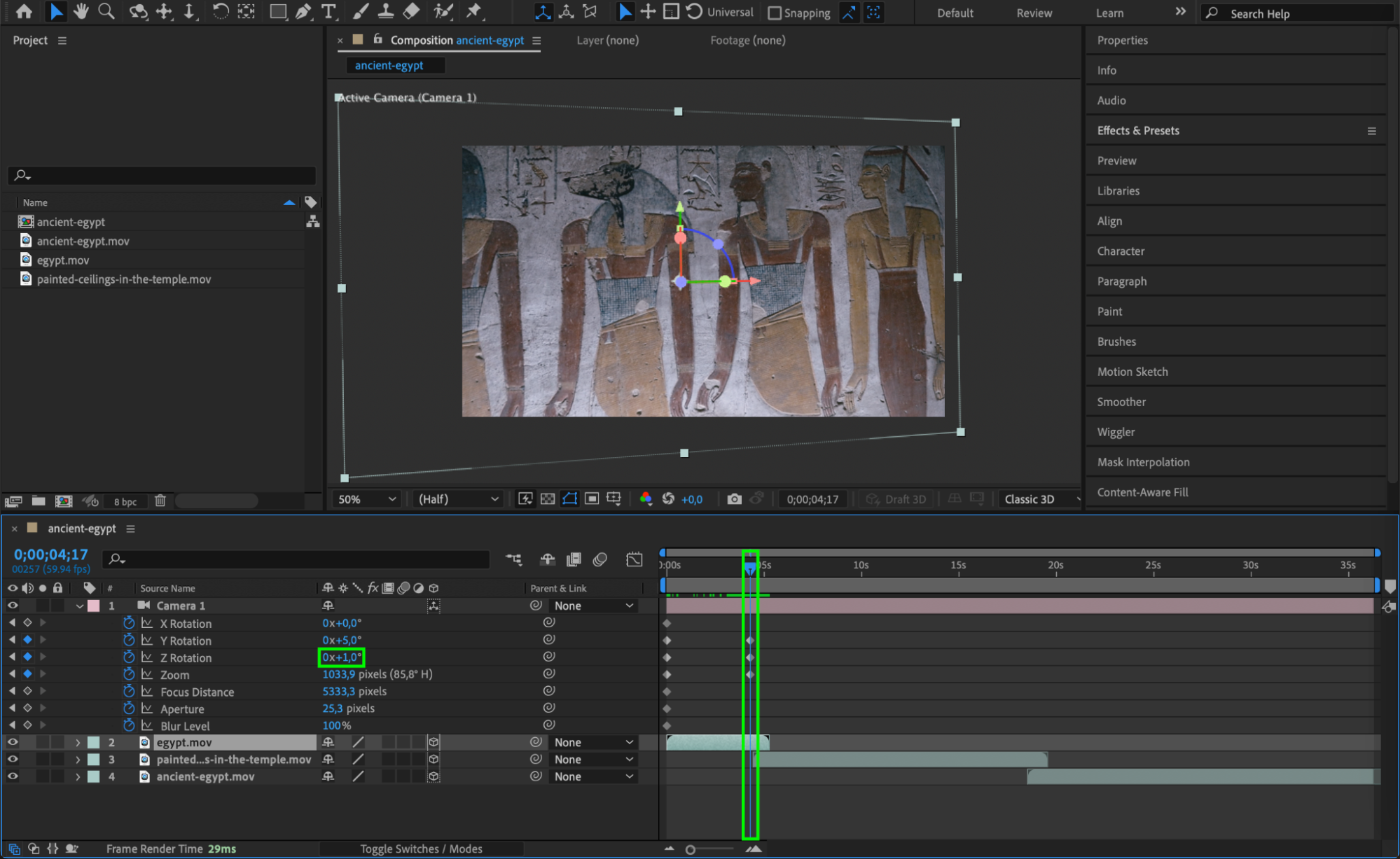 Now that your camera is in place, start animating its movements. Use keyframes to define camera actions such as panning, zooming, or rotating. To set a keyframe, click the stopwatch icon next to the parameter you want to animate (e.g., zoom, rotation). By adjusting these keyframes along the timeline, you create smooth transitions and dynamic movement, adding depth and motion to your 3D movie.
