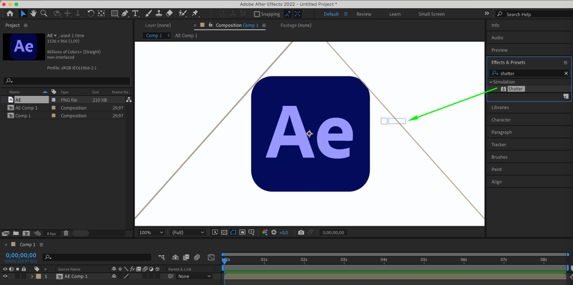 Find the “Shatter” effect in the “Effects & Presets” panel and drag it onto your composition.