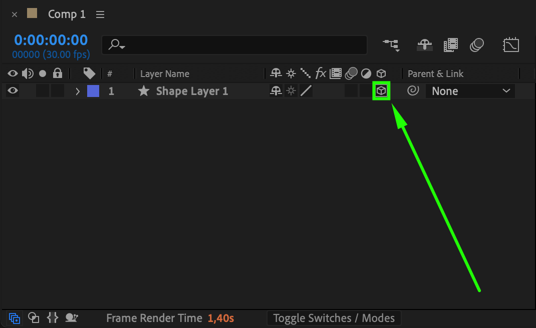 In the Timeline panel, activate the 3D Layer option for your circle shape layer. This enables 3D properties like rotation and material settings.