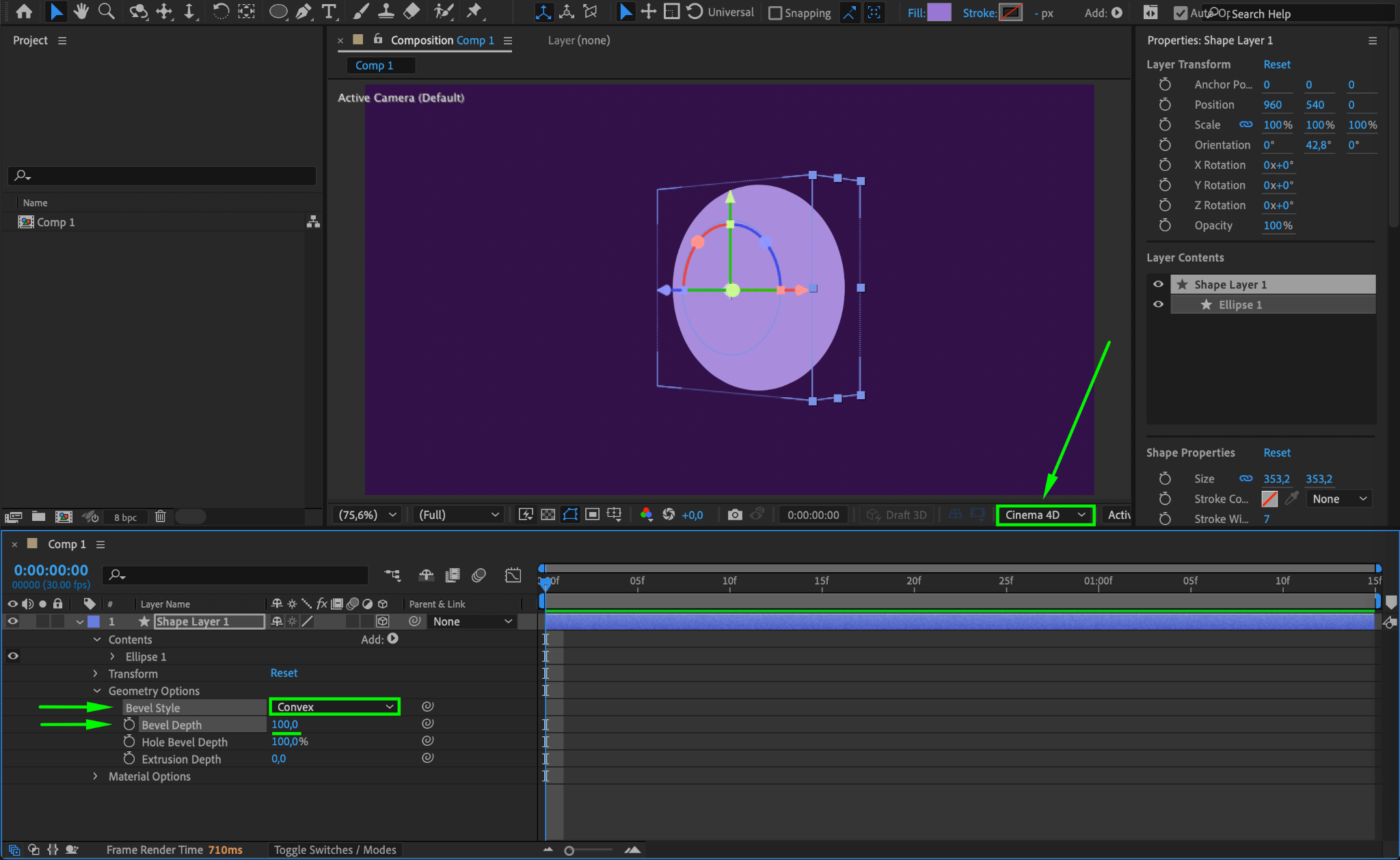 At the bottom of the Composition panel, click on the Renderer settings and change it from Classic 3D to Cinema 4D. This unlocks advanced 3D properties like bevels and extrusion. Once you’ve switched to Cinema 4D Renderer, expand the Geometry Options under the shape layer in the Timeline. Modify the following settings to give your circle depth and a 3D appearance: