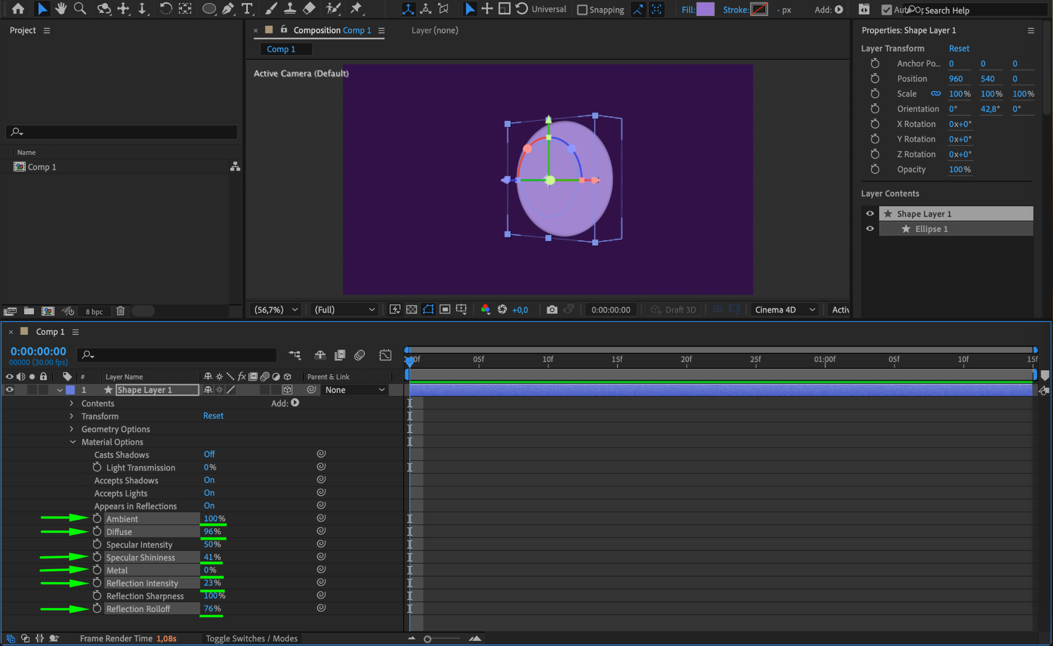 These settings control how light interacts with your 3D circle, making it look more realistic with highlights and reflections.